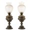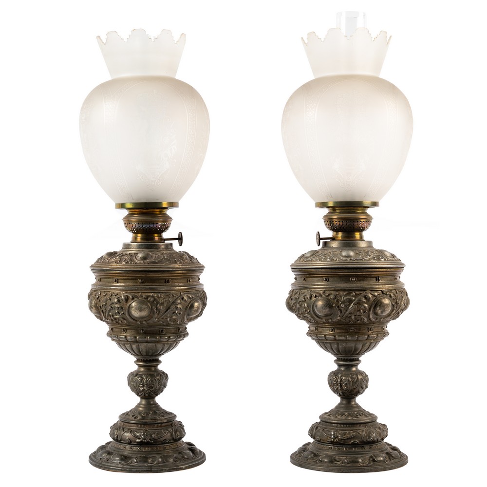 COPPIA DI LUMI a petrolio in metallo e bocce in vetro (elettrificati).