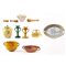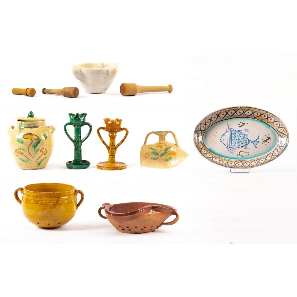 Mortaio in marmo con tre pestelli, due lumiere, fiasca, due scolapasta, burnia e piatto da portata in ceramica smaltata.