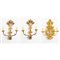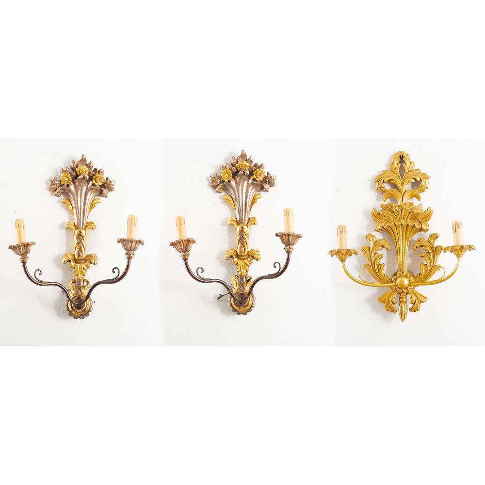 Coppia di applique a due luci in ferro e legno dorato e applique a due luci in legno dorato e ferro.