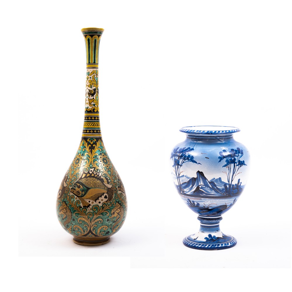 Vaso a collo stretto in ceramica smaltata e decorata raffigurante "Figure marine" e vaso in ceramica smaltata e decorata nei toni del blu raffigurante "Paesaggio".