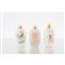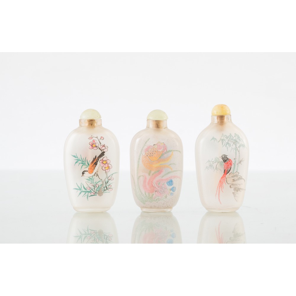 Tre piccole bottiglie di vetro con decori a motivo floreali e volatili.
