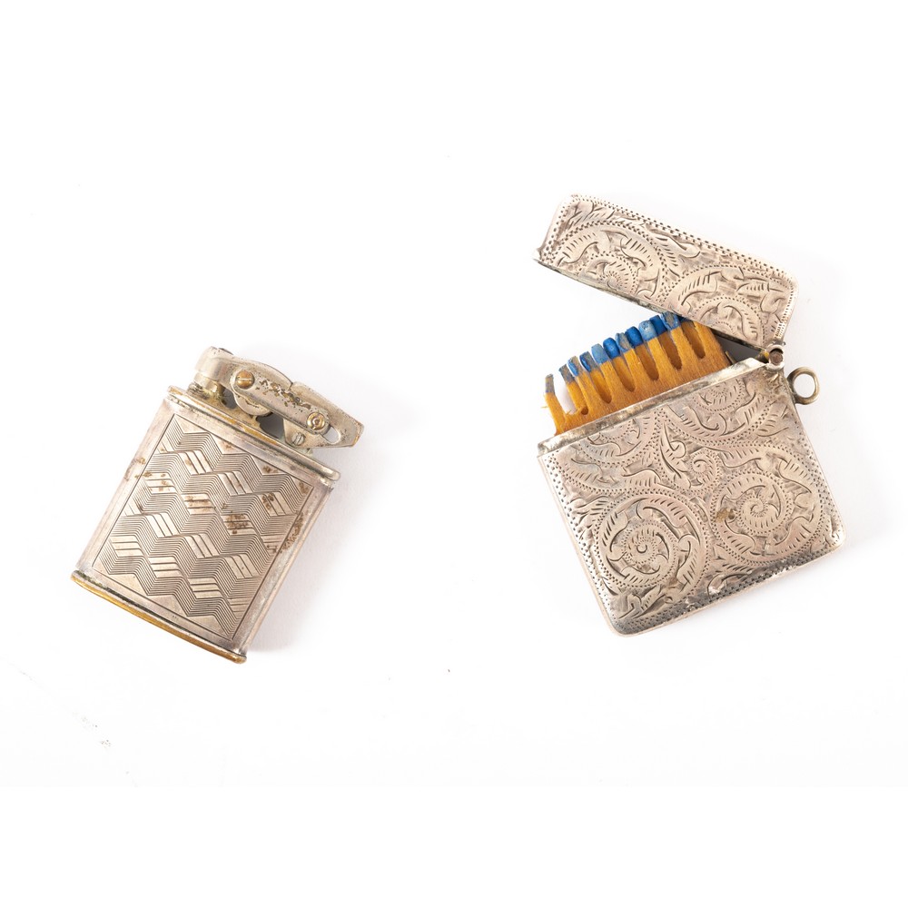Portacerini in argento cesellato Birmingham 1900 con monogramma F G. Argentiere John Alexander Fettes e accendino D.R.P. Germany in metallo e argento 935 (usure).