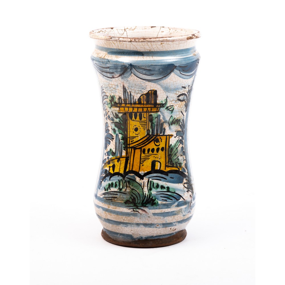 Albarello in ceramica smaltata e decorata raffigurante "Paesaggio con castello" (filature e usure).