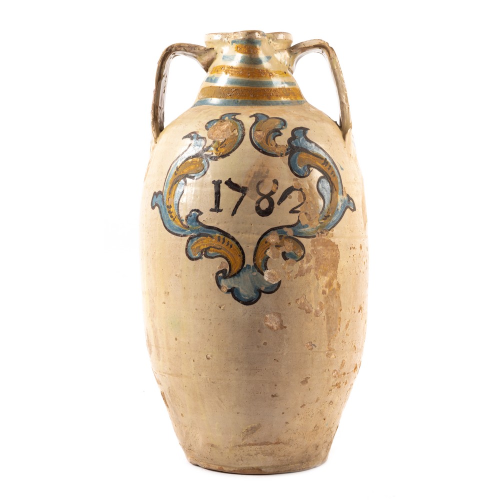 Anfora in ceramica smaltata e decorata datata "1782" (usure e mancanze).