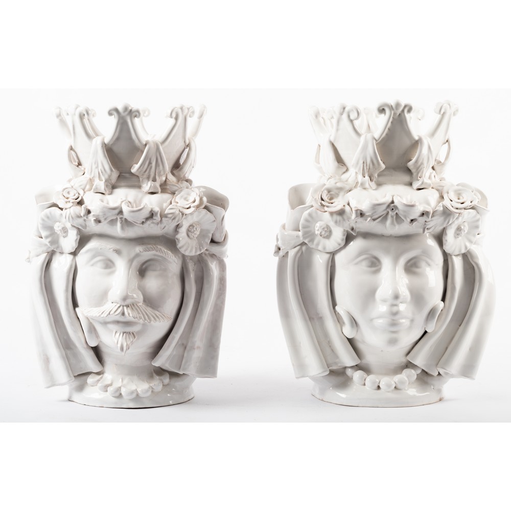 COPPIA DI PORTAVASI in ceramica smaltata nei toni del bianco raffigurante "Teste di Moro".