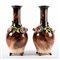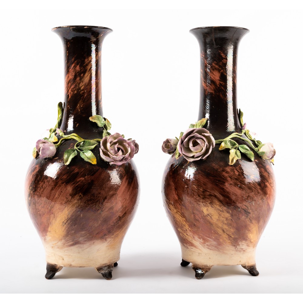 Coppia di vasi in ceramica smaltata e decorata guarnita da fiori e foglie, periodo Liberty (usure e mancanze).