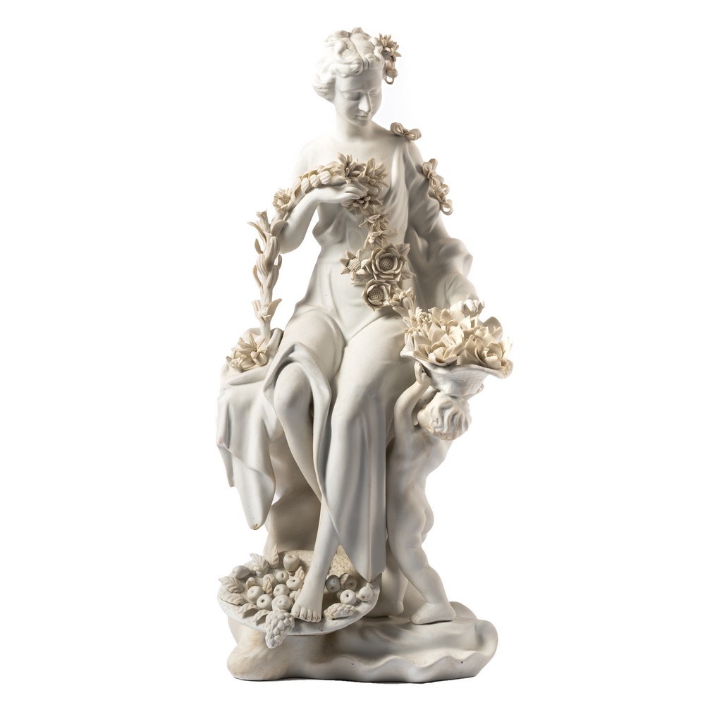 Biscuit raffigurante "Figura allegorica femminile e putto con tralcio di fiori e frutta".