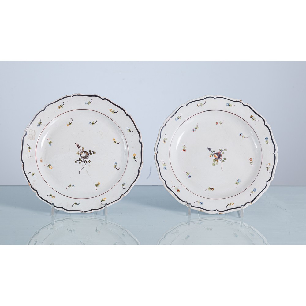 Coppia di piatti in maiolica decorata a motivi floreali con perfili nei toni del marrone di manganese (usure del tempo).