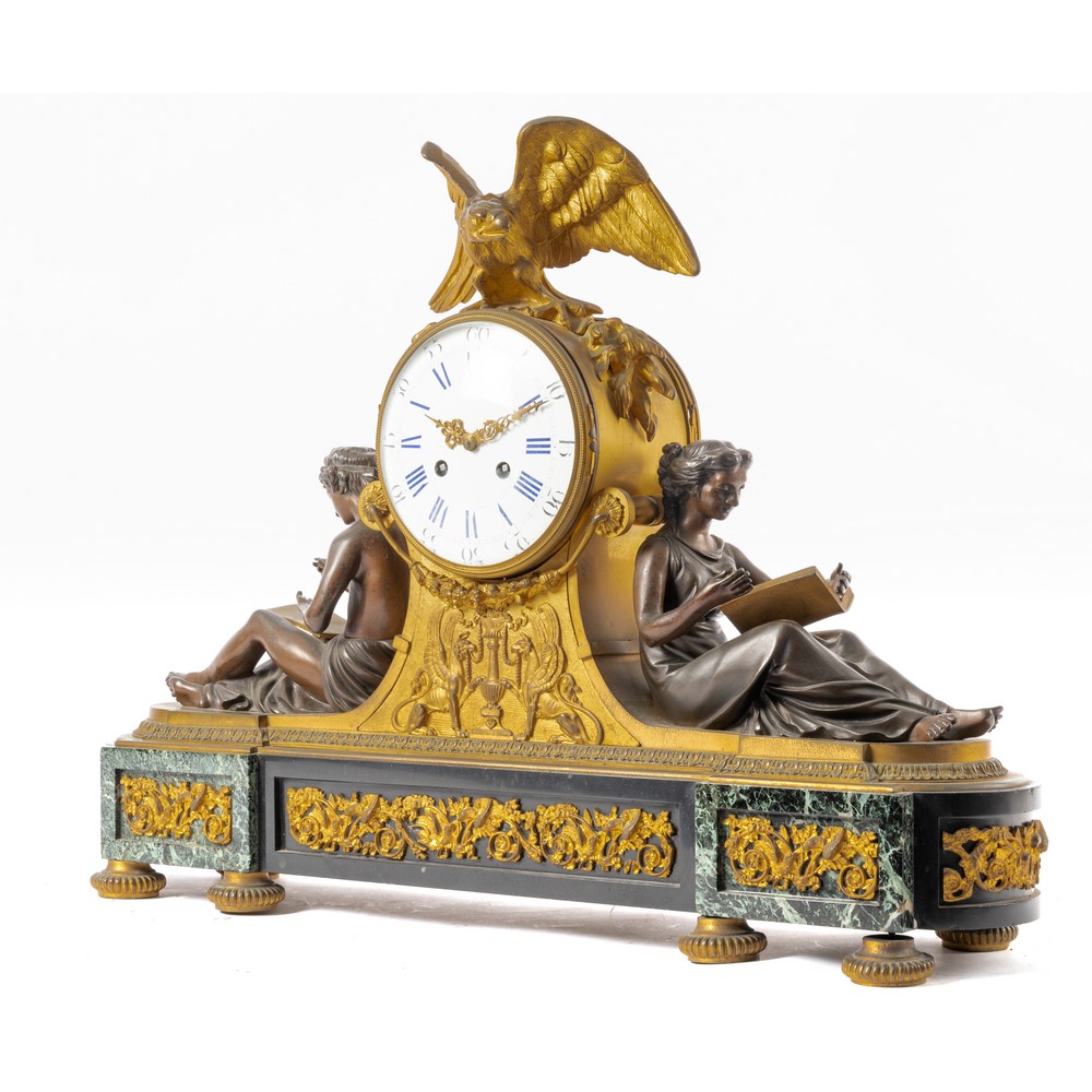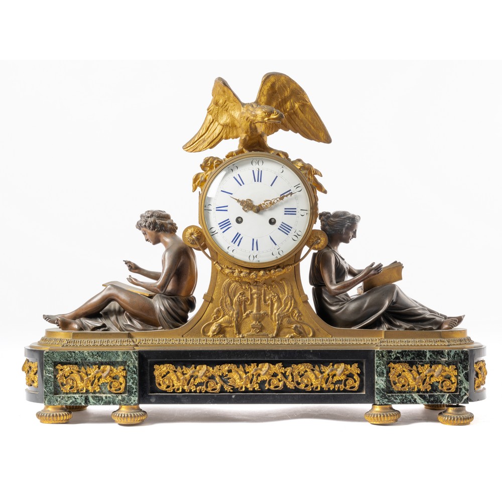 Imponente pendola in bronzo dorato e brunito con base in marmo verde delle Alpi, con figure ai lati e nella parte superiore scultura raffigurante "Aquila".