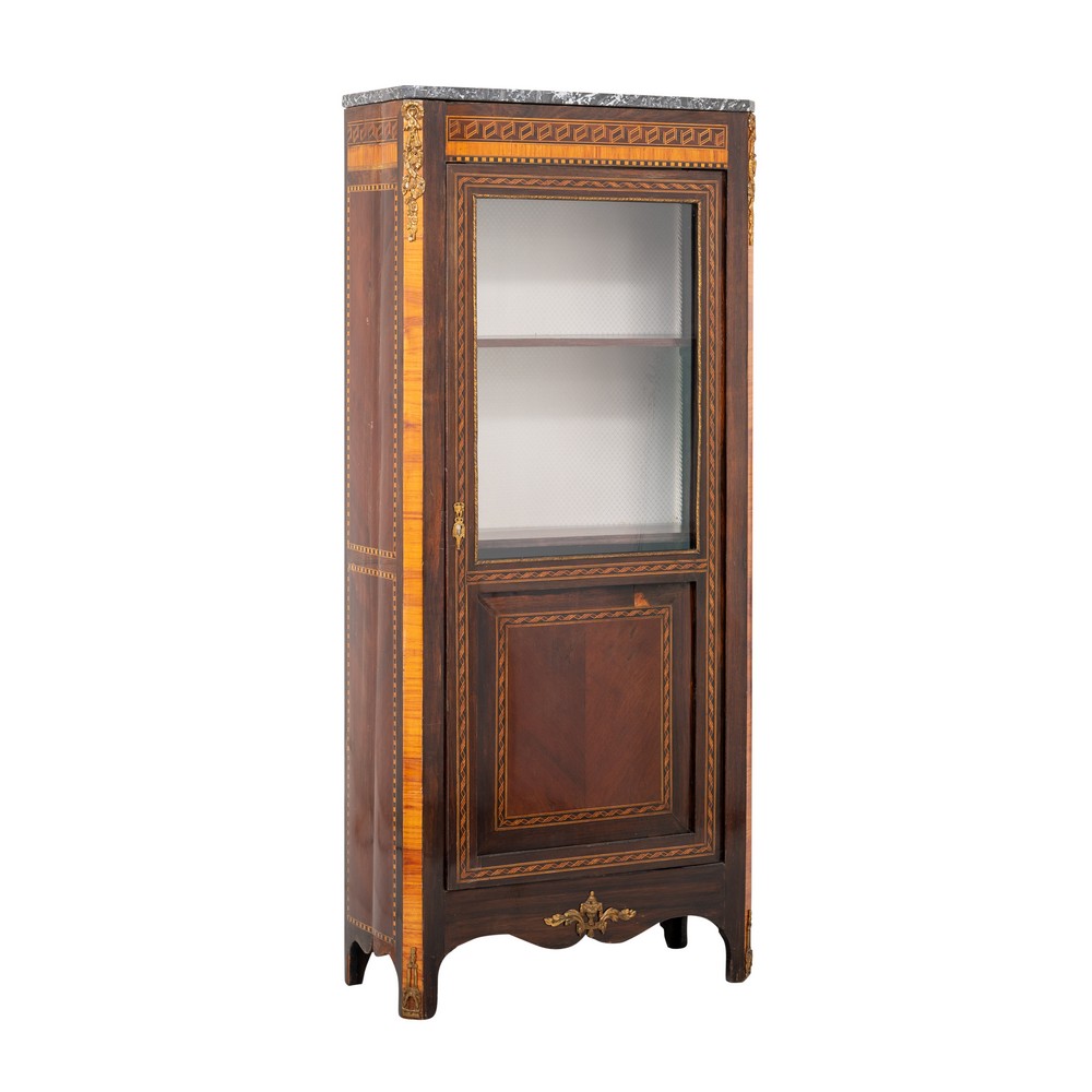 Vetrinetta stile Luigi XVI ad un'anta in varie essenze di legno, intarsiata con disegno geometrico in legno di palissandro e bois de rose, perfili in bosso efregi in bronzo, piano in marmo grigio venato.