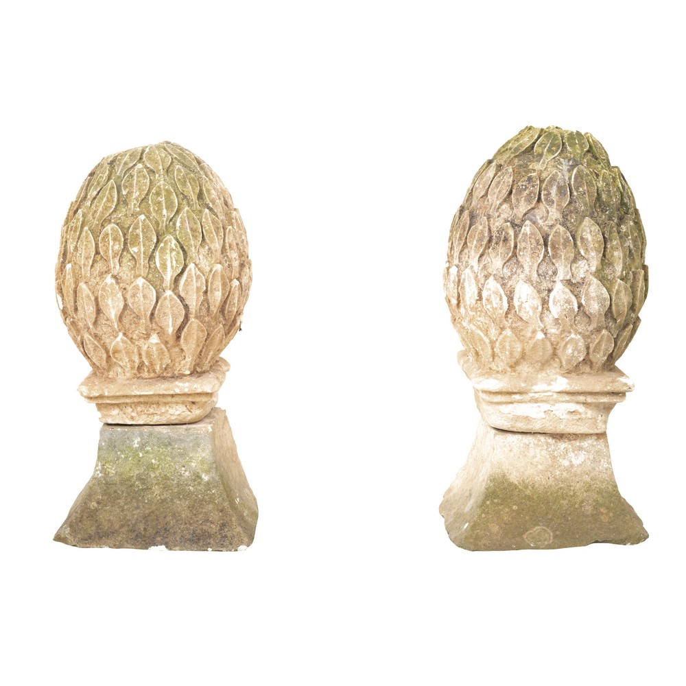 Coppia di pigne con fiamma in pietra Ragusana (usure).