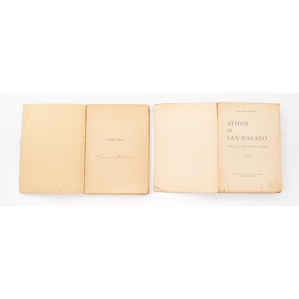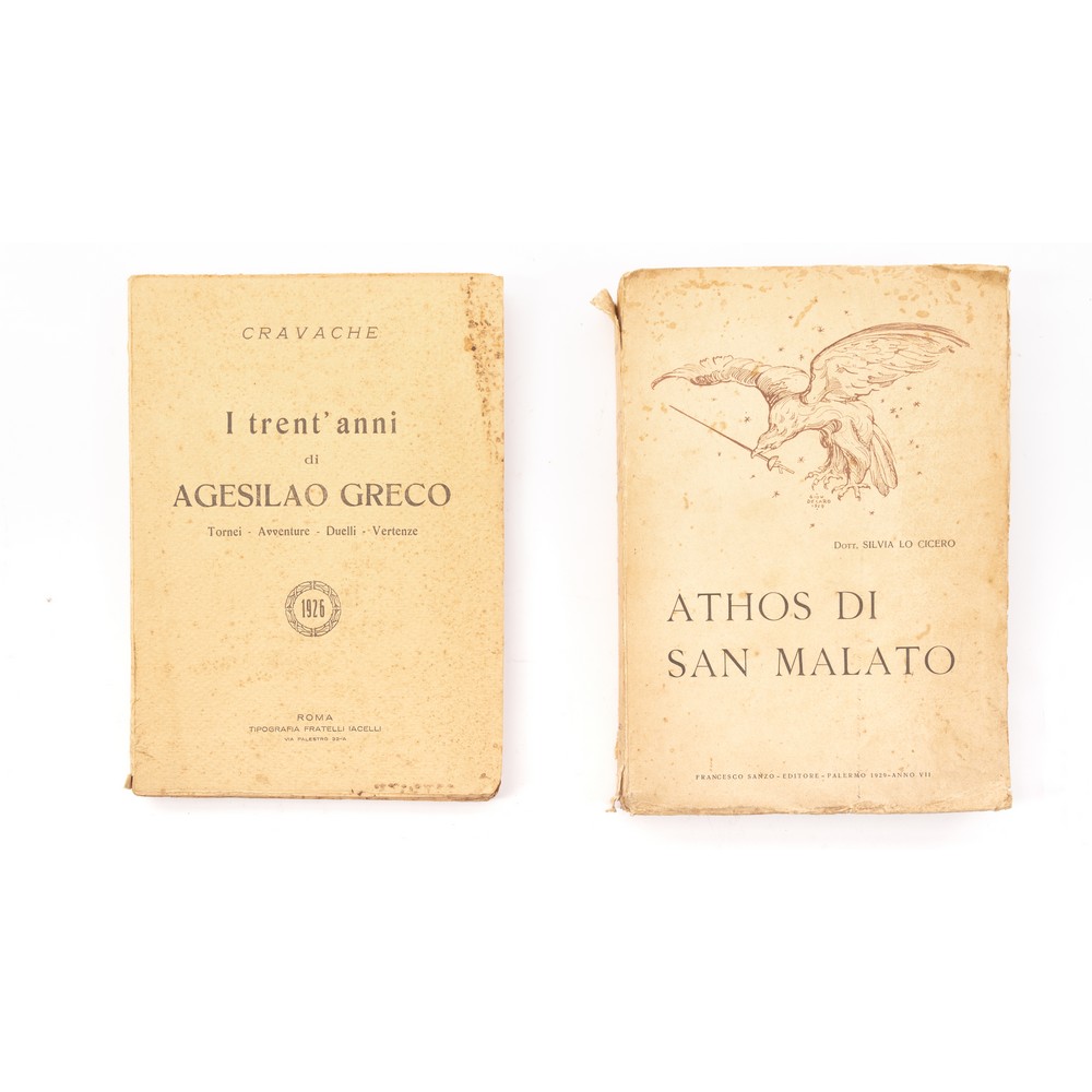 DUE VOLUMI SU DUE GRANDI SCHERMIDORI SICILIANI: 1) Cravache I TRENT’ANNI DI AGESIALO GRECO. TORNEI, AVVENTURE, DUELLI, VERTENZE, ed. Roma Fratelli Iacelli 1926. in 8° grande. Brossura editoriale marginosa. Tagli anch’essi marginosi. Qualche sporcizia al piatto ma volume in ottime condizioni. Agesilao Greco (Caltagirone, 1866 – Roma, 1963) è stato uno schermidore italiano, oltre che teorico e didatta della scherma, autore di diversi trattati. È considerato colui che ha rivoluzionato il corso della scherma ed è stato protagonista della sua trasformazione da arte quasi iniziatica a moderna disciplina sportiva di rango olimpico. Pp. 138. 2) Silvia Lo Cicero ATHOS DI SAN MALATO, ed. Francesco Sanzo, Palermo 1929. in 8° grande. Brossura editoriale figurata marginosa. Tagli anch’essi marginosi. Qualche sporcizia al piatto ma volume in ottime condizioni. Importante opera riguardante l'arte del duello e la figura di Athos di San Malato Staiti, schermidore straordinario. Con tavole fotografiche in bianco e nero che illustrano sia alcuni duelli che alcune tecniche di scherma ed armi, e vari ritratti dello spadaccino. Esemplare di particolare rarità. Athos di San Malato (1868-1934), di origini trapanesi e figlio del famoso spadaccino Turillo di San Malato. La fama di Athos di San Malato come spadaccino superò quella del padre. Egli, infatti, si distinse per aver battuto tutti i più grandi schermidori del vecchio e del nuovo continente. Athos di San Malato fu inoltre inventore di una nuova impugnatura per la sciabola ed ideatore di una tecnica schermistica di non facile esecuzione detta della “centralizzazione dell’arma al braccio”, che fu poi adottata dall’Esercito Regio. In un suo libro “La partita d’onore e le sue leggi” Athos descrisse le regole che disciplinavano la partita d’onore, il duello, nei suoi aspetti morali, giuridici e tecnici. Volume raro a trovarsi. Pp. 275.