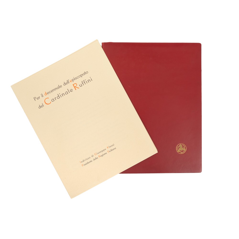 CARTELLA IN PELLE, con segna pagine in pelle, con lo stemma della Trinacria in oro, contenente lo storico discorso del 10 Giugno 1956, pronunciato durante il suo secondo mandato da Giuseppe Alessi, 1° Presidente della Regione Siciliana, per il decennale dell’episcopato del Cardinale Ruffini. Il documento è firmato in originale dall’Alessi.