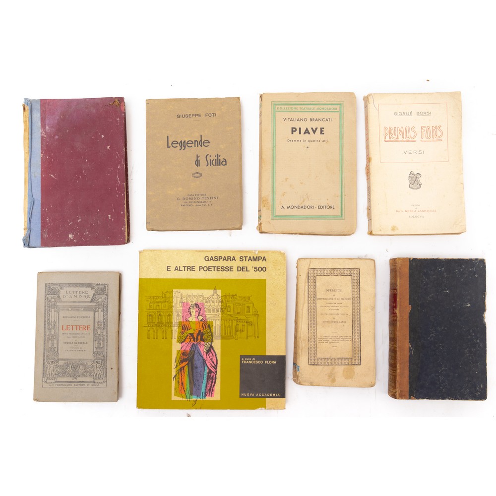 OTTO VOLUMI IN MISCELLANEA DEL XIX E XX SECOLO: 1) Ercole Quadrelli ABELARDO ED ELOISA. LETTERE, Roma, A. F. Formiggini, 1927. 1^edizione e prima traduzione italiana dal testo latino di Ercole Quadrelli. Prefazione di Antonio Bruers. In 16°. Brossura originale con titoli ai piatti e ai dorsi. Tagli irregolari. In perfette condizioni. La copertina è foderata in carta Ingres. Al piatto anteriore cornice architettonica di Giuseppe Mazzoni. Al piatto posteriore la marca Artioli. Pp. XXIII, 160, (4).2) Salvatore Farina AMORE BENDATO, ed. Milano, Ambrogio Centenari, 1889. Incisione del ritratto del Farina in antiporta. Bella vignatta tipografica al frontespizio. 1^ edizione, illustrata dal pittore G. Canella con le incisioni di A. Centenari. In 8° piccolo. Legatura rifatta in mezza tela muta con piatti cartonati. Usurata e con dorso assente. Una piccola foratura di tarlo ormai debellato al margine destro. Pagine pulite e ben tenute, tranne qualche sporadicissima fioritura. Pp. 238. 3) Bartolomeo Gamba DUE ILLUSTRI PROSE DI MESSER GIOVANNI BOCCACCIO, ed. Venezia Tipografia di Alvisopoli MDCCCXXV. In 16°. Brossura editoriale. Fioriture e bruniture del tempo ma in ottime condizioni. Pagine irregolari. In antiporta ritratto xilografato di Giovanni Boccaccio realizzata dall’incisore Marco Comirato. Pp. 172.4) Giuseppe Foti LEGGENDE DI SICILIA , ed. G. Domino Testini 1937 – XV. In 16° brossura editoriale marginosa. Pagine pulite e ben tenute. In perfette condizioni. Pp. 176. Di difficile reperibilità.5) Vitaliano Brancati PIAVE, ed. A. Mondadori, Milano 1932 – XI. 1^ edizione. In 8° piccolo. Brossura editoriale marginosa con ali e tagli marginosi. Opera in ottime condizioni. Pp. 166 (1). 6) Giosuè Borsi PRIMUS FONS. VERSI, ed. Zanichelli, Bologna 1907. Brossura editoriale con tagli marginosi e irregolari. Usure alla brossura al piatto e al dorso, ma opera in ottime condizioni. Pp. 176.7) Francesco Flora – a cura di - GASPARA STAMPA E LE ALTRE POETESSE DEL ‘500, ed. Nuova Accademia 1962. Legatura editoriale con sopraccoperta editoriale in cartonato illustrato. Opera in ottime condizioni. In formato 8° carrè. Pp. 200 con 14 tavole in b7N nel testo a inizio del volume. 8) Pellegrino Rossi TRATTATO DI DIRITTO PENALE, ed. Torino, Gaetano Bozza 1859. In 8° piccolo. Legatura coeva in mezza pelle con piatti marmorizzati. Titoli in oro al tassello al dorso. fregi in oro al dorso. In ottime condizioni. Pp. XXII, (2), 591, (4). In incipit dell’opera incisione del ritratto di Pellegrino Rossi eseguito dall’incisore Luigi Bridi.