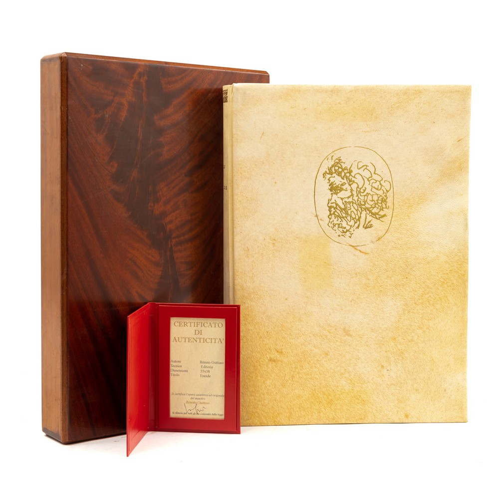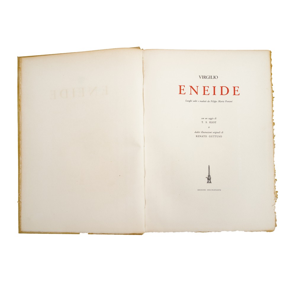 Virgilio. ENEIDE. LUOGHI SCELTI E TRADOTTI DA FILIPPO MARIA PONTANI. Con un saggio di T.S. Eliot e dodici illustrazioni di Renato Guttuso. Edizioni dell’Elefante, 1979. In folio, cm 51,5 x 36,5 x 5h. Volume entro custodia originale in noce, con una leggera scollatura, Legatura in pergamena con titolo e fregi in oro al dorso e al piatto. Tagli in barbe. Esemplare n. 143 della tiratura di 999 copie. Opera di grandissima cura tipografica con testi e tavole a colori. Certificato di garanzia della casa editrice.