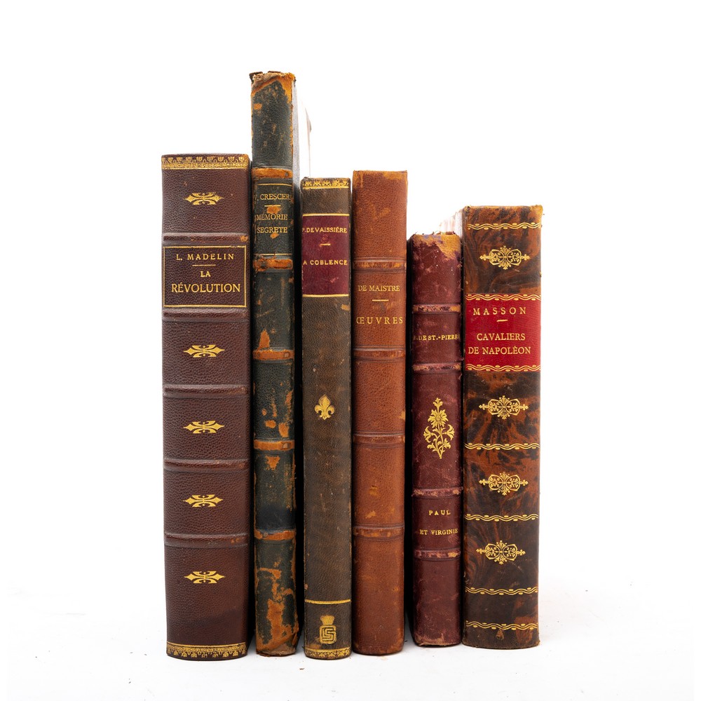 SEI VOLUMI IN LINGUA STRANIERA CON BELLE LEGATURE DI INIZIO XX SECOLO: 1) Jacques-Henri Bernardin de Saint-Pierre PAUL ET VIRGINIE, ed. Paris Librairie des Bibliophiles s. d. ( ma 1878). In 16°. Bella legatura in mezza pelle di vitello con titoli e fregi incisi in oro al dorso e piatti marmorizzati. Quattro nervature al dorso e tagli irregolari. In perfette condizioni. Segni d’uso al dorso. Contropiatti e risguardie marmorizzate. Pp. LXII, 192. 2) Frederic Masson CAVALIERS DE NAPOLEON, ed. Paris Paul Ollendorff 1896. In 8° piccolo. Seconda edizione. Bella legatura in mezza pelle di vitello marmorizzata con titoli incisi in oro al tassello al dorso e fregi e decori incisi in oro al dorso; piatti marmorizzati. Tagli irregolari. In perfette condizioni. In perfetto stato di conservazione. Contropiatti e risguardie marmorizzate. Pp. 400.3) Xavier de Maistre OEUVRES, ed. Paris, A Roger et F. Chernoviz s. d. (ma primissimi del ‘900). In 8° piccolo. Bella legatura in mezza pelle di vitello con titoli incisi in oro al dorso e piatti marmorizzati. Quattro nervature al dorso. In perfette condizioni. Contropiatti e risguardie marmorizzate. Pp. LX, 298.4) Pierre de Vaissiere A COBLENCE OU LES EMIGRES FRANCAIS DANS LES PAYS RHENANS DE 1789 A 1792, ed. Parsi, Les Belles Lettres 1924. In 8° piccolo. Bella legatura, che contiene le brossure originali, in mezza pelle di vitello con titoli, filetti e fregi nobiliari incisi in oro al dorso e piatti marmorizzati. In perfette condizioni. Segni d’uso al dorso. Contropiatti e risguardie floreali. Pp. XI, 215, (6). 5) Freihernn von Helfert MEMORIE SEGRETE, ed. Wien, 1892. In 8°. Bella legatura in mezza pelle di vitello con angoli e titoli e filetti incisi in oro al dorso e piatti marmorizzati. Cinque nervature al dorso. In ottime condizioni. Segni d’uso al dorso. Contropiatti e risguardie decorate. Pp. 260. 6) Louis Madelin LA REVOLUTION, ed. Paris, Hachette 1912. In 8°. Bella legatura in mezza pelle di vitello con angoli e fregi incisi in oro al dorso; piatti marmorizzati. Quattro belle nervature al dorso con titoli incisi in oro entro tassello. In perfette condizioni. Contropiatti e risguardie floreali. Pp. VII, , 578.