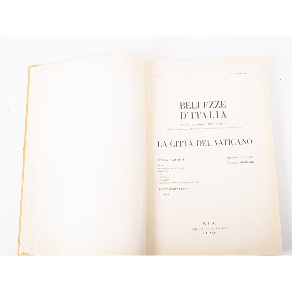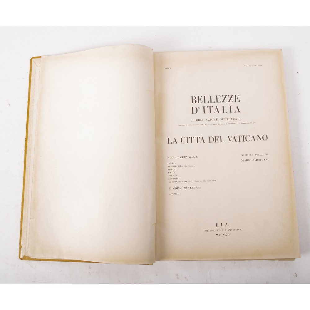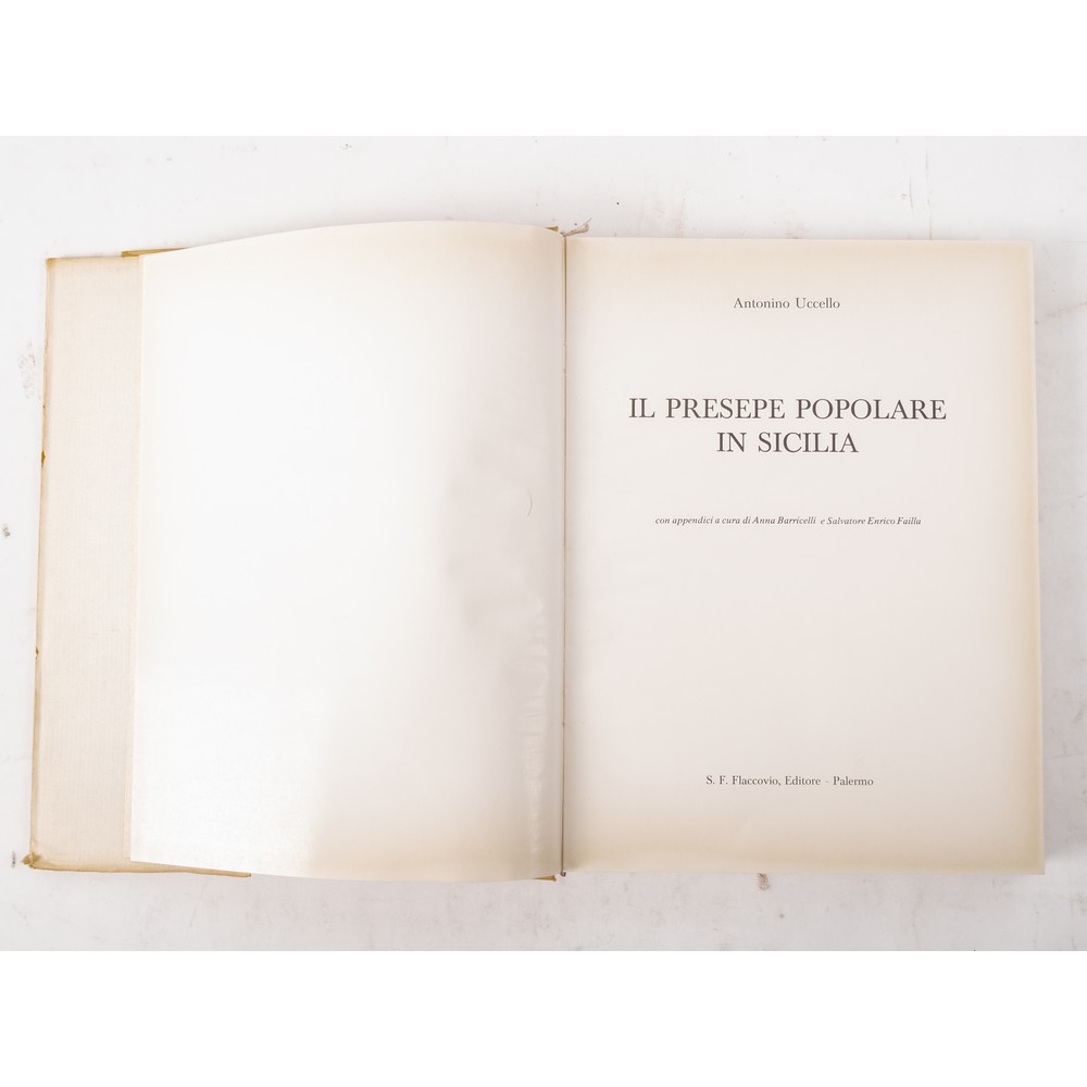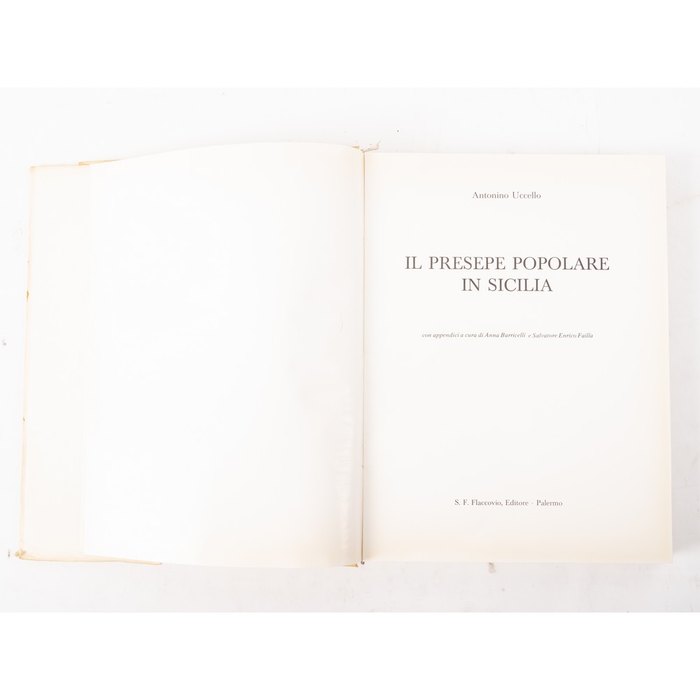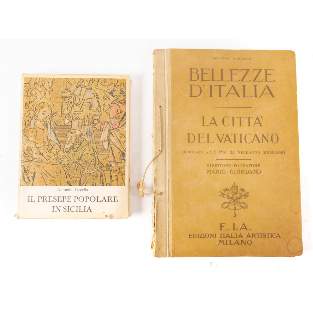DUE VOLUMI D’ARTE: 1) Antonino Uccello IL PRESEPE POPOLARE IN SICILIA, ed. S. F. Flaccovio 1979. Legatura in piena tela rigida con titoli oro al piatto e al dorso, sovraccoperta editoriale illustrata. Contropiatti e guardie illustrate. Usure alla sopraccoperta ma volume in ottime condizioni. Cm 33 x 25. Pp. 319 con 35 tavole a colori e 18 in b.n, 2) AA. VV. BELLEZZE D’ITALIA. CITTA’ DEL VATICANO, ed. E.I.A. Edizioni Italia Artistica 1930. Anno V volume fuori serie. Direttore Mario Giordano. In folio. Legatura editoriale in mezza tela e piatti cartonati con legatura a cordoncino, e con titoli al piatto. Pp. (22), 192 (4); segue Le Ridenti Plaghe D'italia, con pp . 22, oltre pp. 50 di pubblicità di fornitori di vario materiale peri il Vaticano.
