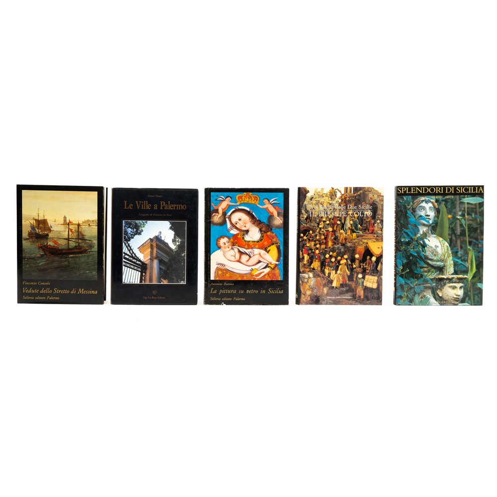 CINQUE VOLUMI D’ARTE: 1) Antonino Buttitta LA PITTURA SU VETRO IN SICILIA, ed. Sellerio 1991. Serie I Cristalli. Legatura editoriale in tela con fotoapplicazione al piatto; sopraccoperta editoriale illustrata. In ottime condizioni. Cm 34 x 25. Pp. 192.2) Vincenzo Consolo VEDUTE DELLO STRETTO DI MESSINA, ed. Sellerio 1993. Serie I Cristalli. Legatura editoriale in tela con fotoapplicazione al piatto; sopraccoperta editoriale illustrata. In ottime condizioni. Cm 34 x 25. Pp. 182.3) NEL REGNO DELLE DUE SICILIE. IL PRESEPE COLTO, con un racconto di Vincenzo Consolo, ed. Nuova Tavolozza 1993. Cm 35 x 25. Legatura editoriale in tela con sopraccoperta editoriale illustrata. In ottime condizioni. Pp. 179.4) Eliana Mauro LE VILLE A PALERMO, ed. Ugo La Rosa 1992. Cm 34 x 25. Legatura editoriale in tela con sopraccoperta editoriale illustrata. In ottime condizioni. Pp. 205.5) Ingalill Snitt SPLENDORI DI SICILIA, ed. Novecento 1992. Bella ed elegante legatura editoriale in seta verde con fotoapplicazione al piatto. Sopraccoperta editoriale illustrata. Cm 36 x 25. Pp. 194.