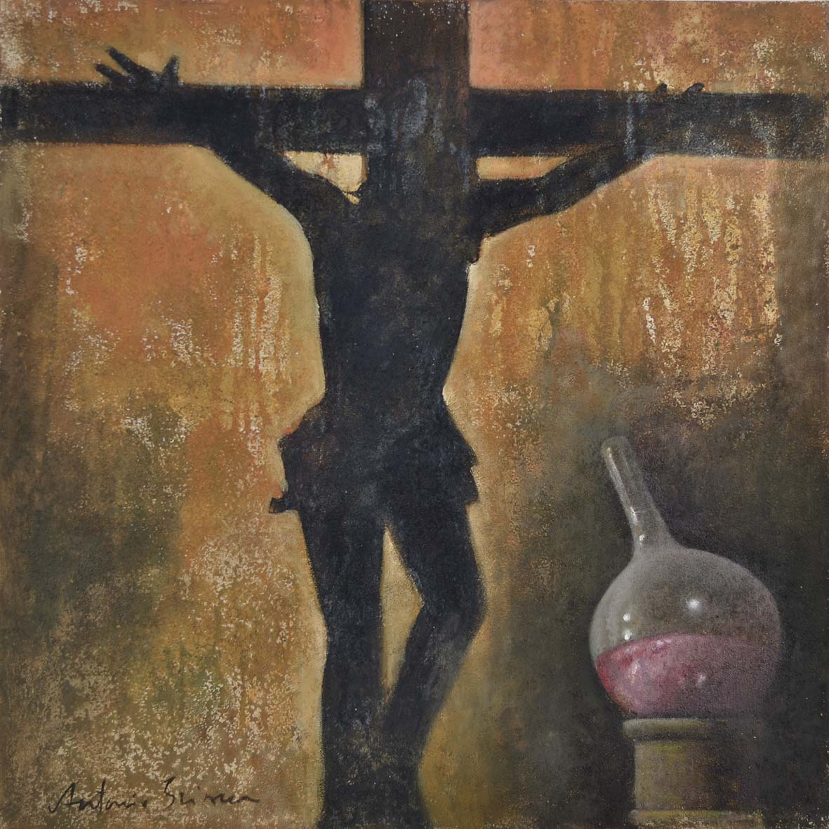 SCIACCA ANTONIO Catania 1957 Crocifissione e alchimia olio e tecnica mista su tela 60x60 firma in basso a sinistra firma e titolo al retro Autentica dell'Autore su foto e al retro