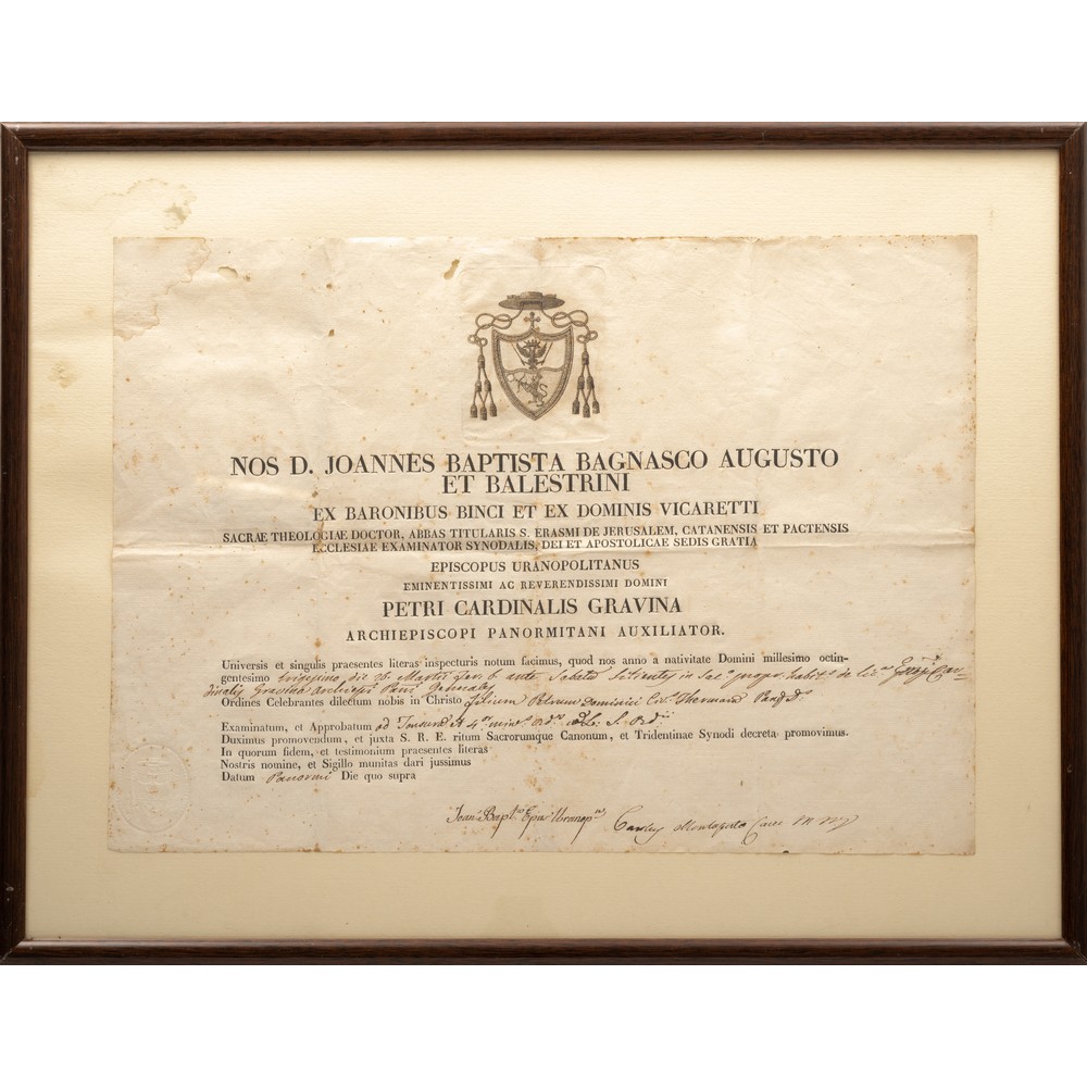 DECRETO datato 26 Marzo 1830 a firma di Giovanni Battista Bagnasco (Palermo 1791 – Monreale 1837), nominato il 23 Giugno 1828, da Papa Leone XII, Vescovo di Verinopoli ( detta anche Uranopoli) e ausiliario del Cardinale di Palermo Pietro Gravina. Il documento, di cm 29,5 x 41,5, è una promozione alla celebrazione del Rito Sacro Canonico e Tridentino concessa a Don Pietro Dominici di Termini Imerese. In testa al documento incisione calcografica dello stemma del Vescovo anche riportato in basso a sx a secco. Firma autografa. Raro. Il decreto è incorniciato con cornice in legno novecentesca.