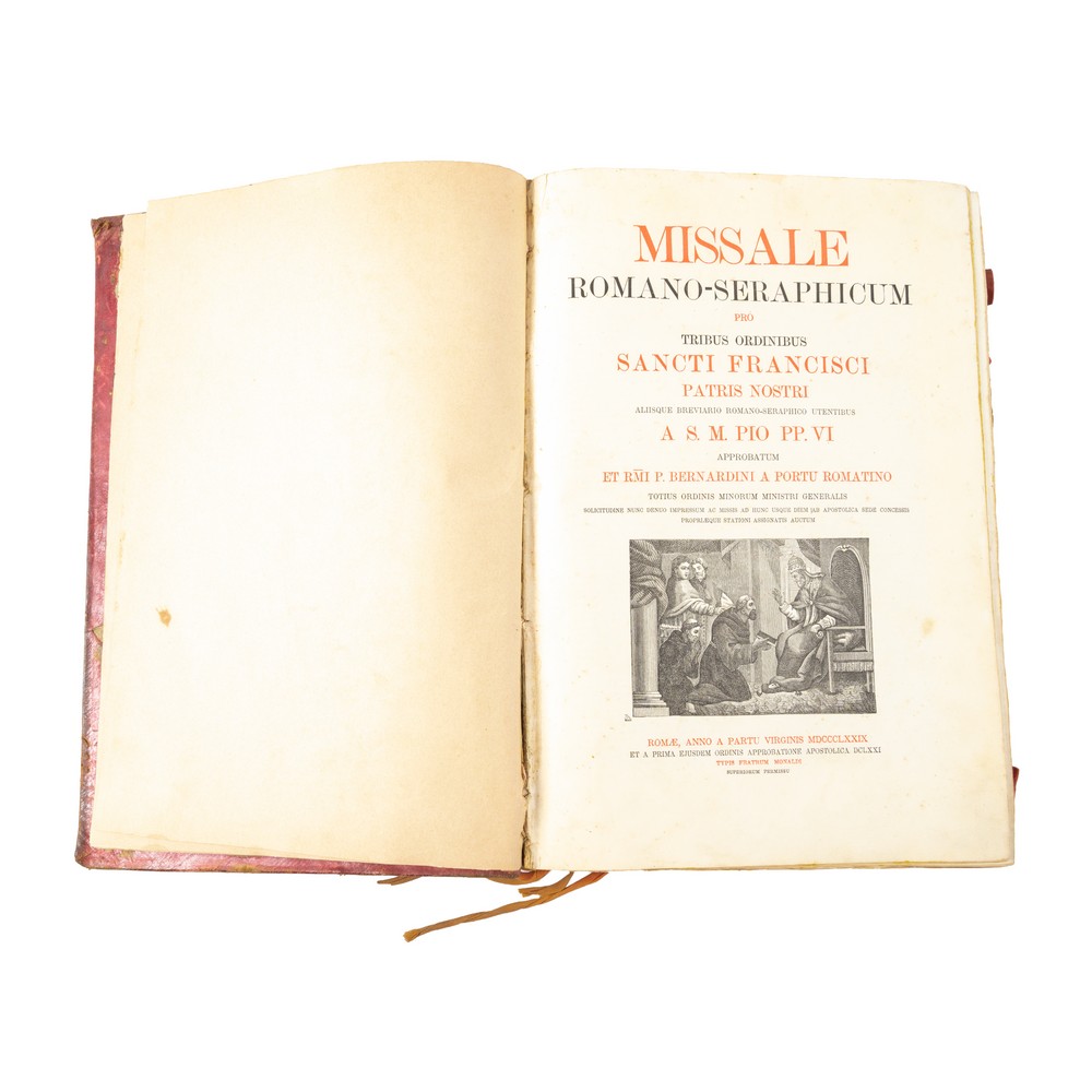 MISSALE ROMANO SERAPHICUM PRO TRIBUS ORDINIS SANCTI FRANCISCI PATRIS NOSTRI Aliisque Breviario Romano Seraphico Utentibus a. S. Pio PP. VI approbatum et RMI Bernardini a Portu Romatino, Romae Anno Partu Virginis MDCCCLXXIX Typis Fratrum Monaldi. In folio. Bella legatura in piena pelle impressa a freddo con stemma ai piatti dell’Ordine dei Francescani. Decorazioni, cornici e fregi in oro ai piatti e al dorso. Stampato in latino in bicromia su due colonne. Capilettera incisi e tavole incise n.t. e 4 belle incisioni xilografate a piena pagina f. t..Segnapagine originali in stoffa.  Stampato durante il Ministero Generalizio di Giuseppe del Vago.più noto come Bernardino da Portogruaro nei confronti del quale nel 1951 è stato aperto il processo di beatificazione. Il 3 luglio 2008 papa Benedetto XVI ha autorizzato la Congregazione delle cause dei santi a promulgare il decreto riguardante le sue virtù eroiche. Alcune pagine slegate. Segni d’uso ai piatti. Pagine pulite e in ottime condizioni. P.p. XXXX, 515, LXXXII, 32 di Supplementum.
