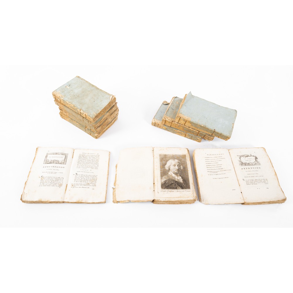 DIECI VOLUMI DEL XVIII SECOLO: OPERE TEATRALI DEL SIG. AVVOCATO CARLO GOLDONI VENEZIANO, CON RAMI ALLUSIVI, ed. Venezia dalle Stampe di Antonio Zatta e Figli MDCCLXXXVIII – MDCCLXXXIX. Delle Commedie in Prosa in 10 volumi. Venezia, dalle stampe di Antonio Zatta e figli, 1788-1793. Opera completa in 10 volumi. In 8°. Volumi in brossura. Le brossure sono usurate e parzialmente slegate con mancanze ai dorsi; tagli marginosi. Paginazione varia. Sui frontespizi e in testa alla maggior parte degli atti vignette calcografiche incise da Daniotto, C. Dall'Acqua, Bonato ed famosi incisori dell’epoca. In antiporta al primo tomo incisione del ritratto di Goldoni realizzato dal Piazzetta e dal Pitteri. Qualche sgualcitura, lievi fioriture e bruniture, qualche mancanza ai bordi delle ultime pagine del primo tomo. Pagine in generale pulite e ben tenute.