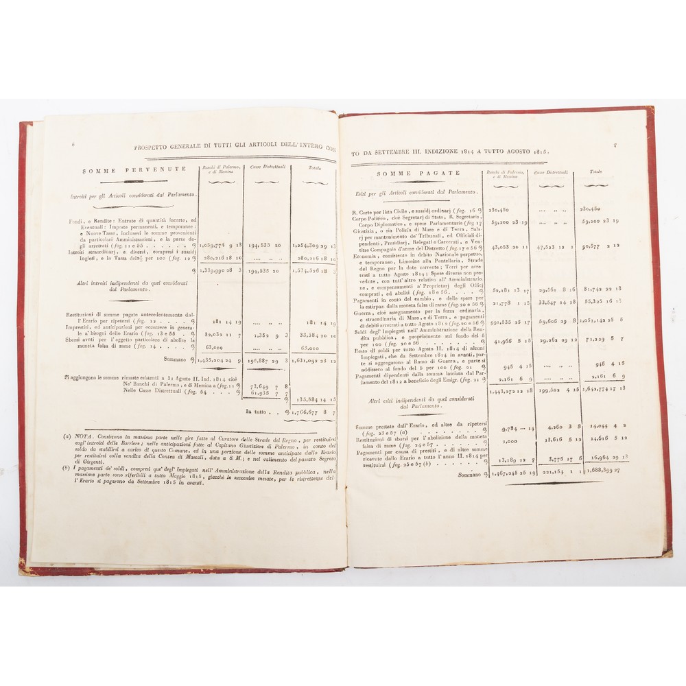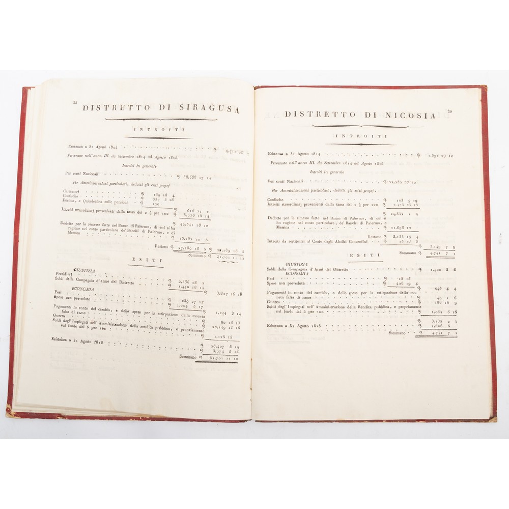 DOCUMENTO A STAMPA : CONTO DELLA REGAL TESORERIA GENERALE DEL REGNO DI SICILIA per l’Anno Terza Indizione da Settembre 1814 ad Agosto 1815. Dalla Reale Stamperia In 4°. Legatura coeva in mezza pelle con piatti in percallina rigida. Cornici fregiate e decorate in oro ai piatti. Raro. qualche sporcizia superficiale, piccole gore alle pagine iniziali e dorso sollevato alle cuffie. Per il resto in perfette condizioni. Interessantissimo documento nel quale appare chiara la suddivisione della spesa amministrativa per classi di spesa e di distretti. Pp. 71.