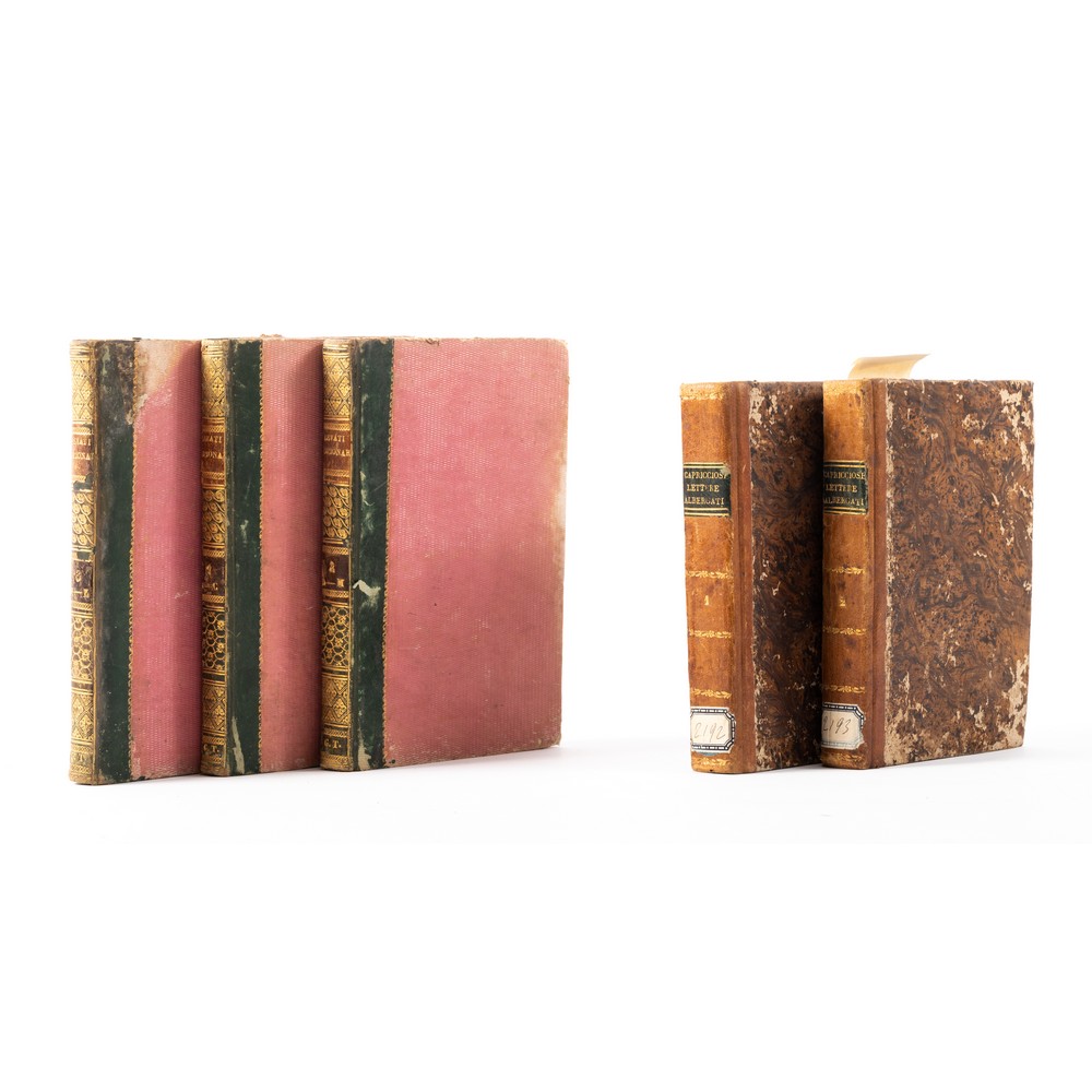 CINQUE VOLUMI DI VARIA DEL XVIII E XIX SECOLO: 1) LETTERE CAPRICCIOSE DI FRANCESCO ALBERGATI CAPACELLI E DI FRANCESCO ZACCHIROLI DAI MEDESIMI CAPRICCIOSAMENTE STAMPATE e COMPIMENTO DELLE LETTERE CAPRICCIOSE DI FRANCESCO ALBERGATI CAPACELLI E DI FRANCESCO ZACCHIROLI, senza frontespizio, editore e data, ma verosimilmente editi a Venezia, appresso Carlo Palese 1785. Con una AGGIUNTA DI ALCUNI PICCIOLI OPUSCOLI. Edizione originale del tentativo del commediografo Capacelli (1728-1804), vanto della drammaturgia bolognese, e del poeta Zacchiroli (1750-1826), massone, di creare insieme un genere epistolario divertente su argomenti seri. I 2 volumi in 16° grande presentano una legatura coeva in mezza pelle con piatti cartonati e tagli colorati. Carte in perfetto stato di conservazione. Pp. 344; 344. 2) Ambrogio Levati DIZIONARIO BIOGRAFICO CRONOLOGICO DIVISO PER CLASSI DEGLI UOMINI ILLUSTRI DI TUTTI I TEMPI E DI TUTTE LE NAZIONI. CLASSE V DONNE ILLUSTRI, ed. Milano, Nicolò Bettoni MDCCCXXI – MDCCCXXII. In 3 volumi in 8°. Legature in mezza pelle con piatti marmorizzati e tagli spruzzati. Titoli in oro entro tasselli ai dorsi. Decorazioni e arabeschi in oro ai dorsi. Fioriture sparse ed una gora all’angolo alto del volume III, ma opera in ottimo stato di conservazione. Note manoscritte di possesso. Ambrogio Carlo Levati ( 1790 – 1841) fu erudito enciclopedico, professore di storia. La vastità della sua erudizione, riconosciuta anche dai critici, la potenza della memoria e la facilità di produzione (cfr. Del Chiappa) gli procurarono continue richieste di compendi, volgarizzazioni, prefazioni, traduzioni; anche pubblicazioni periodiche come Il Nuovo Ricoglitore e L'Ape italiana (cfr. Labus) ospitarono, negli stessi anni, suoi contributi e recensioni di letteratura italiana e storia. Nella copiosa e disparata produzione del L. due costanti sono la storia e la letteratura. Tra i molti compendi storici, di discreta diffusione ed editi più volte nella prima metà dell'Ottocento, si possono ricordare il Dizionario biografico cronologico diviso per classi degli uomini illustri di tutti i tempi e di tutte le nazioni. Classe V. Donne illustri (I-III, Milano 1821-22), redatto sulla base di un testo di A. Marsand e parte di un progetto mai portato a termine. Pp. LXIII, 187; 295; VII, 219, XXVII.