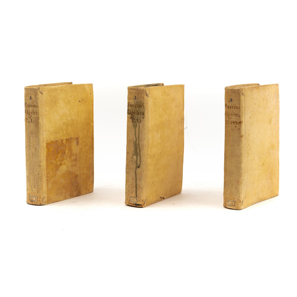 TRE VOLUMI del XCIII secolo: ALGEBRAE GEOMETRIAE PROMOTE ELEMENTA CONSCRIPTA AD USUM FAUSTINAE PIGNATELLI …. AUCTORE NICOLAO DE MARTINO, Excudebat Felix Carolus Mosca sumptibus Cajetani MDCCXXXVII. Il 8° piccolo. Opera completa in tre tomi. Volumi in perfette condizioni. Legatura coeva in piena pergamena con titolo m. s. al dorso. Note manoscritte di possesso e timbro novecentesco di appartenenza. Con marca tipografica e capolettera xilografati. Qualche segno d'uso, e sporadiche fioriture e macchie d’uso. L’opera presenta tutte le tavole più volte ripiegate alla fine dei volumi. Tagli leggermente rifilati. Pp. (20), 424 con una tavola più volte ripiegata f.t. (vol.1); 492 e 3 tavole più volte ripiegate f. t. (vol.2); 458 e 8 tavole più volte ripiegate f. t. (vol. 3). Opera rara a trovarsi completa nei tre volumi. Nicola Antonio De Martino, meglio noto come Niccolò Di Martino o Nicolao De Martino (Faicchio, 3 aprile 1701 – Napoli, 8 dicembre 1769) è stato un matematico italiano. Niccolò fu professore di matematica e direttore del Real Corpo degli Ingegneri e Guardia Marina. Nel 1747 fu nominato socio straniero dell'Accademia delle scienze di Svezia. Faustina Pignatelli (Napoli, 9 dicembre 1705 – Napoli, 30 dicembre 1769) è stata una fisica e matematica italiana. Faustina Pignatelli Carafa, principessa di Colubrano era figlia di Michele e Faustina Caracciolo. È stata la seconda donna a essere ammessa nell'Accademia delle scienze dell'Istituto di Bologna, divenendone socia onoraria il 20 novembre 1732, "avendo attestazioni certissime del grande, e maraviglioso valore di questa Sig.ra nella matematica, e specialmente nell'Algebra. Pubblicò nel 1734 i Problemata Mathematica. Fu allieva prediletta del De Martino che per lei compose la presente opera.