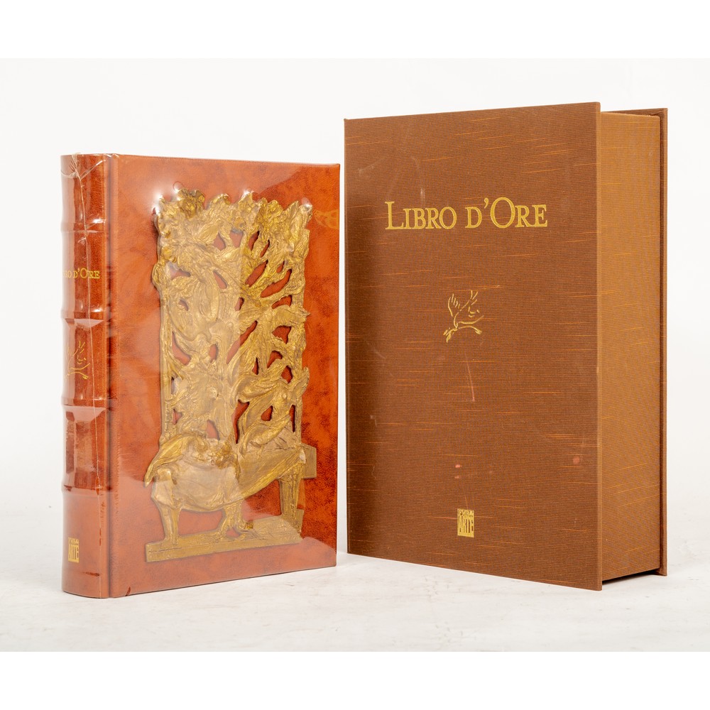 AA. VV. FRANCO MARIA RICCI FMR LIBRO D'ORE - SCULTURA UGO RIVA, ed. FMR Art’è 2003. Singolare opera d’arte libraria, con un’opera originale a bassorilievo in lega dello scultore bergamasco Ugo Riva, formato cm 30 x 18, eseguita in fusione e patinata a mano presso la fonderia d'Arte Fondart di Valbrembo (BG) in tiratura limitata a 975 esemplari e collocata al piatto anteriore. Il volume è custodito in un elegante cofanetto in legno foderato in tela con titoli impressi in oro. Il volume, mai usato, risulta ancora sigillato nel cellophane di protezione originale.