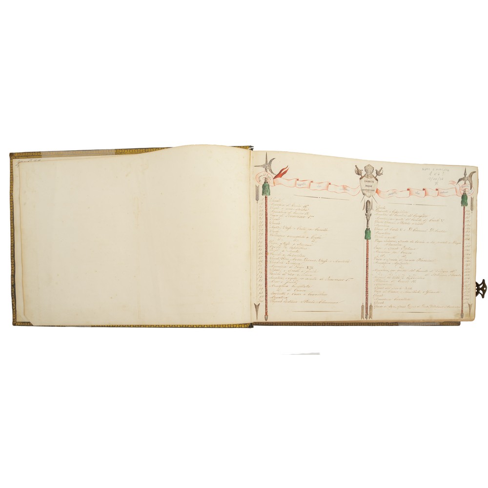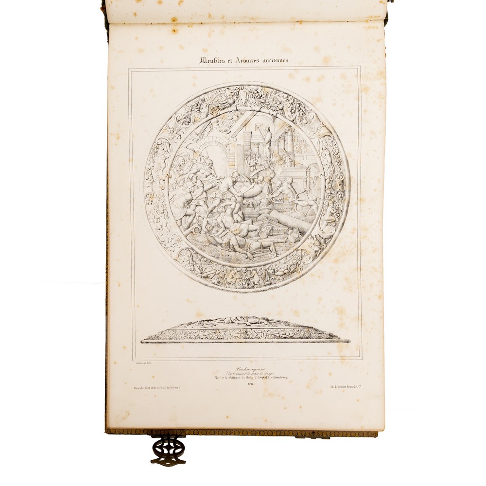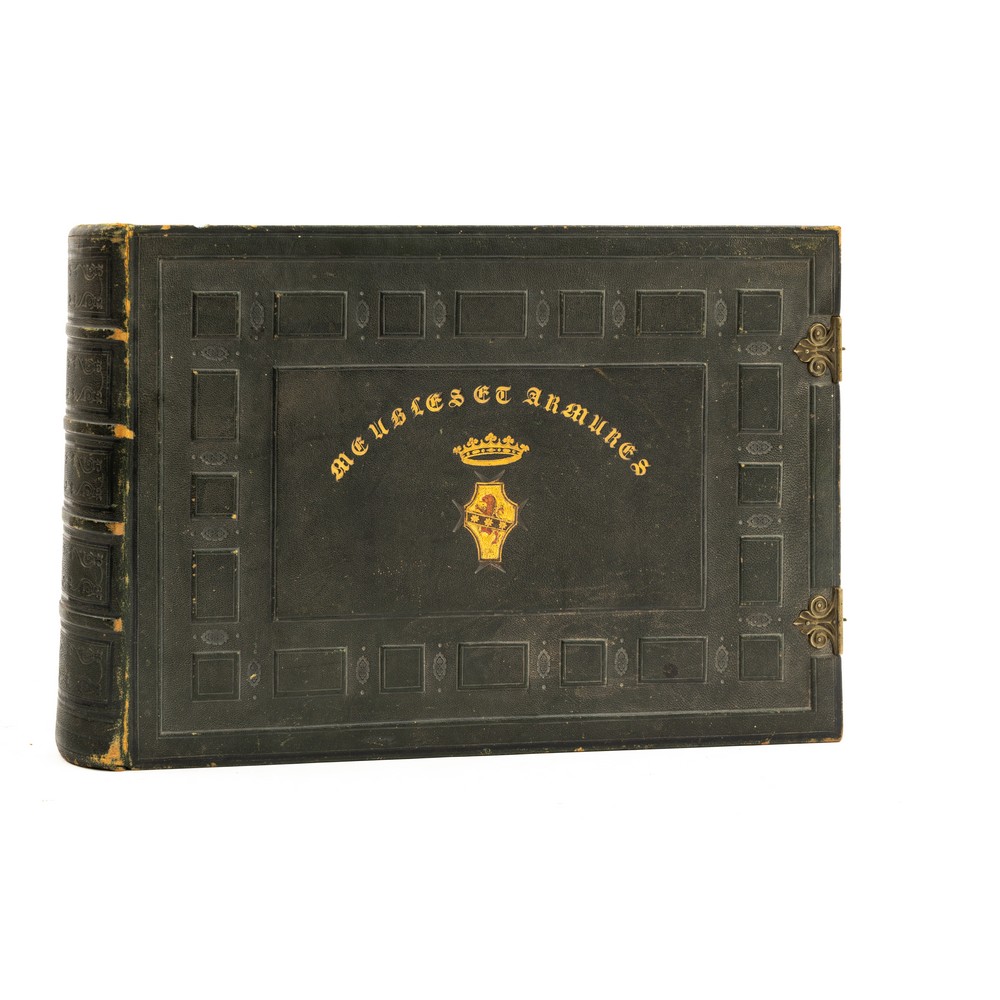 CATALOGO INVENTARIO della fine del XIX / primi del XX secolo, contenente 185 tavole, ognuna delle quali certificata da timbro a secco della Imprimerie A. Hauser di Parigi che ne ha curato la pubblicazione. Il catalogo - inventario contiene la descrizione in tavole di mobili, arredi, armature ed armi presenti in famose collezioni. La sontuosa legatura in piena pelle lavorata e decorata a secco, presenta ai piatti uno stemma, d'oro al leone rampante di rosso con la banda di nero caricata di tre stelle a otto raggi d'oro attraversante; anche i tagli sono rifiniti in oro. La legatura presenta una delle due fibbie metalliche di chiusura ed una splendida lavorazione a cornice in oro ai contropiatti con lavorazione floreale e filetti in oro alle labbra dei piatti. Quattro nervature al dorso. Il dorso si presenta leggermente slegato.