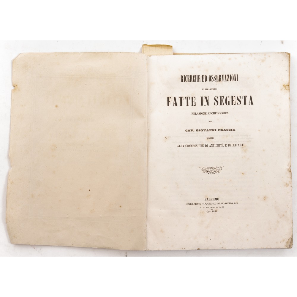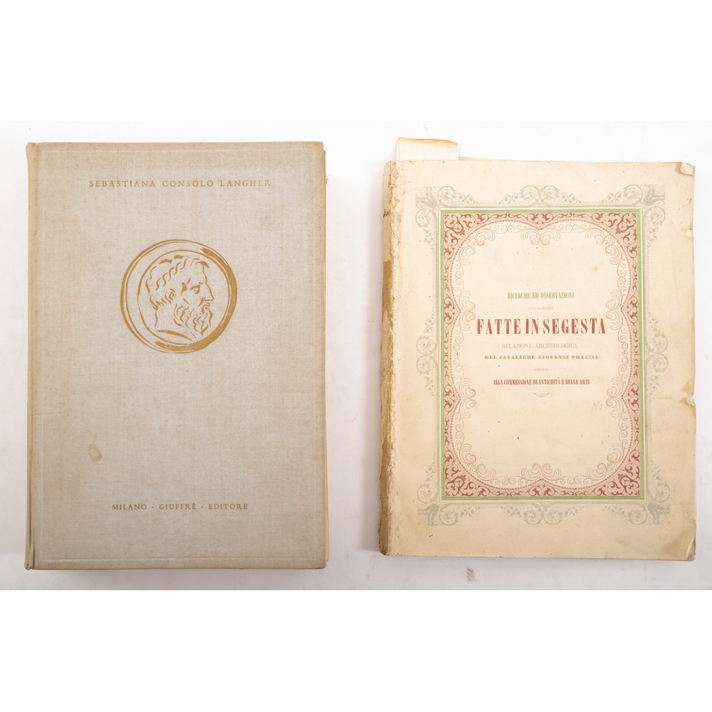 DUE VOLUMI SULLA SICILIA: 1) Sebastiana Consolo Langher CONTRIBUTO ALLA STORIA DELLA ANTICA MONETA BRONZEA IN SICILIA, ed. Milano, Giuffrè 1964. 1^ edizione. Tavole a colori e in bianco e nero numerate fuori testo. Legatura editoriale in piena tela con titoli impressi in oro al piatto e al dorso. Volume in ottimo stato di conservazione. usuali segni del tempo. Copia n. 449. Pp. 406 con CXL tavole f.t. in bn. 2) Cav. Giovanni Fraccia RICERCHE ED OSSERVAZIONI ULTIMAMENTE FATTE IN SEGESTA. RELAZIONE ARCHEOLOGICA DEL CAV. GIOVANNI FRACCIA DIRETTA ALLA COMMISSIONE DI ANTICHITA’ E BELLE ARTI, ed. Palermo Francesco Lao 1855; unito a SOPRA CIO’ CHE ULTIMAMENTE ERASI COMINCIATO A SCOVRIRE IN SEGESTA. BREVE RAGGUAGLIO DEL CAV. GIOVANNI FRACCIA, ed. Palermo, Stamperia della Vedova Solli 1856. In 4°. Mutila della brossura posteriore. Contiene due tavole e una carta f.t. più volte ripiegata in fine, con l’elenco dei ritrovamenti. Pubblicazione rarissima. In ottime condizioni di conservazione. Pp. 52; 59 (2), oltre le tavole. Giovanni Fraccia, archeologo e numismatico (Palermo 1824 – Cagliari 1892). Dedicatosi per tempo agli studi antiquari, si occupò principalmente delle antichità sicule, ebbe varii incarichi governativi relativamente a scavi e monumenti antichi, e fu, dal 1870 al 1873, direttore del Museo di Palermo. Nel 1879 veniva nominato direttore del Museo di Cagliari. I suoi lavori numismatici si riferiscono tutti ad antiche monete della Sicilia, e furono poi riunite sotto il titolo di: Antiche monete Siciliane pubblicate pel primo dal Cav. Giovanni Fraccia, nel periodico il Buonarrotti di Roma, nel 1889 e 1890.