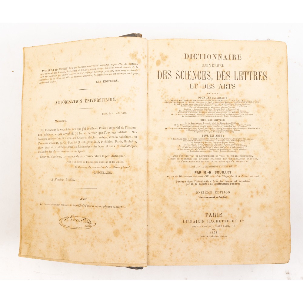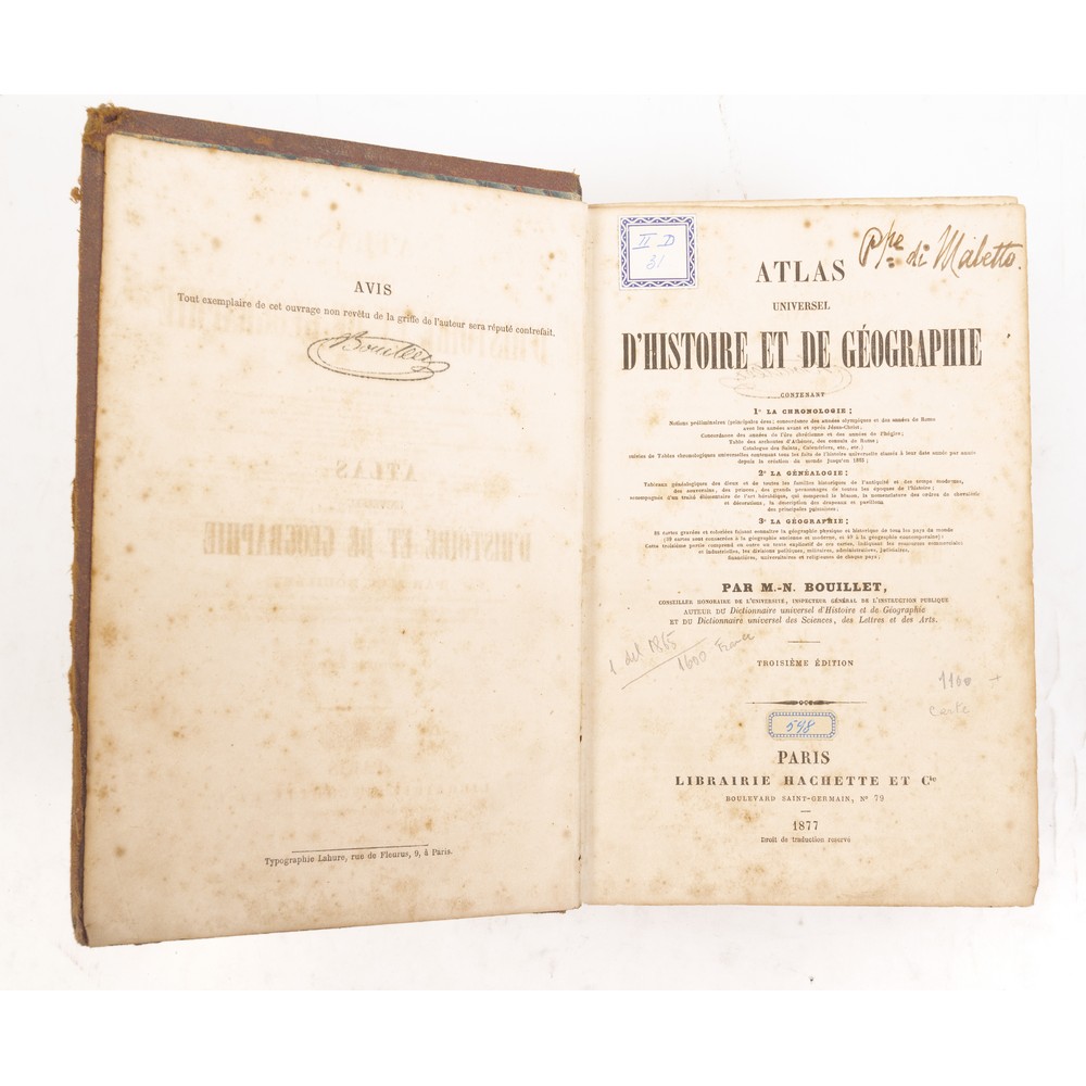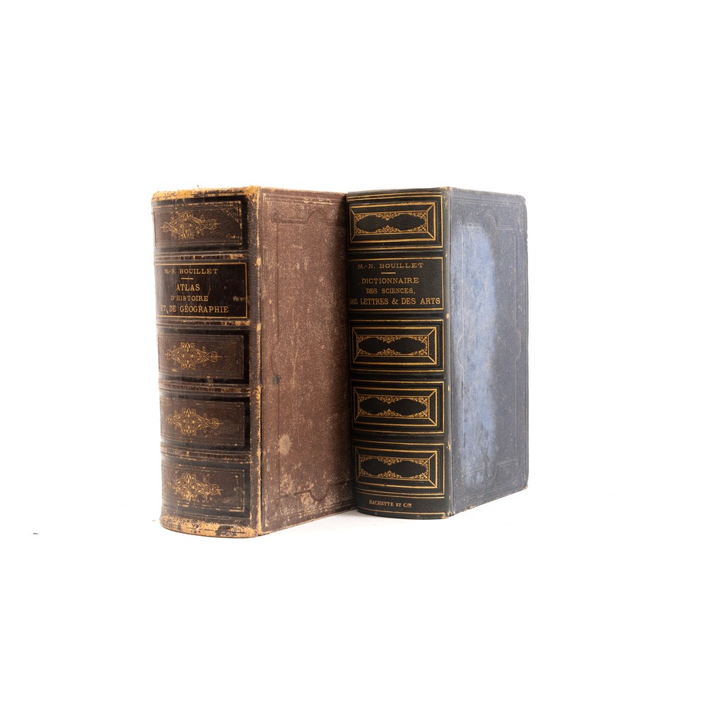 DUE VOLUMI DEL XIX SECOLO DELLE EDIZIONI HACHETTE DI PARIGI: 1) N. Bouillet ATLAS UNIVERSEL D’HISTOIRE ET DE GEOGRAPHIE, CONTENANT 1° LA CHRONOLOGIE, 2° LA GENEALOGIE, 3º LA GEOGRAPHIE, ed. Paris, Hachette et C. 1877. In 8° grande. Bella legatura editoriale in mezza pelle con piatti telati rigidi decorati a cornice. Titoli e fregi in oro al dorso. Con cinque nervature al dorso. Con 88 mappe doppie incise e colorate che mostrano la geografia fisica e storica di tutti i paesi del mondo. Testo in francese su due colonne. Monumentale opera che contiene numerose tavole genealogiche delle famiglie regnanti, degli stemmi araldici e delle bandiere degli stati. Pp. 1101. La pag. 799 presenta una menda. 2) N. Bouillet DICTIONNAIRE UNIVERSEL DES SCIENCES, DES LETTRES ET DES ARTS, CONTENANT CONTENANT: LES SCIENCES MÉTAPHYSIQUES ET MORALES, LES SCIENCES MATHÉMATIQUES, LES SCIENCES PHYSIQUES, LES SCIENCES MÉDICALES, LES SCIENCES OCCULTES, LA GRAMMAIRE, LA RHÉTORIQUE, LA POÉTIQUE, LES ETUDES HISTORIQUES, LES BEAUX-ARTS, LES ARTS UTILES. ed. Paris, Hachette et C. 1874. In 8° grande. Bella legatura editoriale piena percallina rigida decorati a cornice. Titoli e fregi in oro al dorso. Con quattro finte nervature al dorso. Pp. 1817.