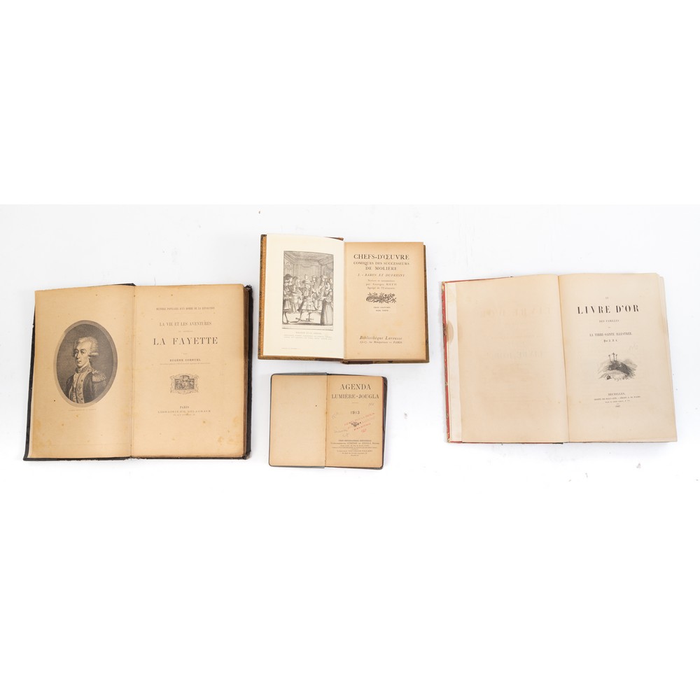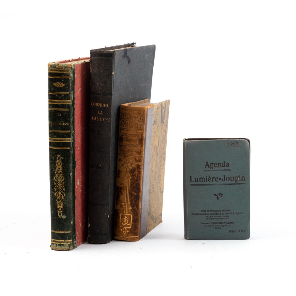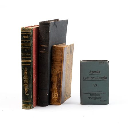 QUATTRO VOLUMI IN MISCELLANEA IN LINGUA FRANCESE : 1) LE LIVRE D’OR DES FAMILLES OU LA TERRE – SAINTE ILLUSTREE, ed. Societe des Beaux-Arts, Bruxelles 1847. 1^ edizione. In 8°. Rilegatura in mezza pelle con titoli e decorazioni impresse in oro al dorso. piatti marmorizzati. Alcune gore ai tagli e qualche brunitura del tempo. Con qualche usura d’uso ai piatti. Nel complesso in ottime condizioni. Pp. 232 con numerose litografie e xilografie nel testo e fuori testo; 1 carta pieghevole della Palestina in fine. 2) Eugene Cornel LA VIE ET LES AVENTURES DU GENERAL LA FAYETTE, ed. Paris Delagrave s. d. In 4°. Legatura successiva in piena tela rigida con titoli in oro al dorso. Pagine leggermente brunite dal tempo. Fioriture sparse. Tagli marginosi irregolari. Pp. 238 (1) con tavole fuori testo e pagine ancora intonse. 3) CHEFS D’OEUVRE COMIQUES DES SUCCESSEURS DE MOLIERE, ed. Bibliotheque Larousse, Paris s. d. 1 volume che raccoglie 2 tomi. In 8°. Contiene: "L'homme à bonne fortune" di Baron; "L'esprit de contrediction" e "La coquette de village" di Dufresny; “O le chevalier à la mode", "La maison de campagne" e "Les bourgeoises de qualité" di Dancourt.legatura editoriale in mezza pelle con titoli in oro al dorso e piatti marmorizzati. Due illustrazioni alle antiporte dei volumi. Pp. 206; 220. 4) AGENDA LUMIERE - JOUGLA 1913, ED. Gauthier Villas, Paris 1913. Un volume in 12°. Legatura editoriale in tela, con tagli colorati. In perfette condizioni. Manuale di fotografia di inizio del XX secolo, fonte di innumerevoli notizie per gli appassionati e gli storici. Pp. 526 con illustrazioni nel testo ed una tasca in fine contenente i codici di lettura delle fotografie e degli delle tecniche.