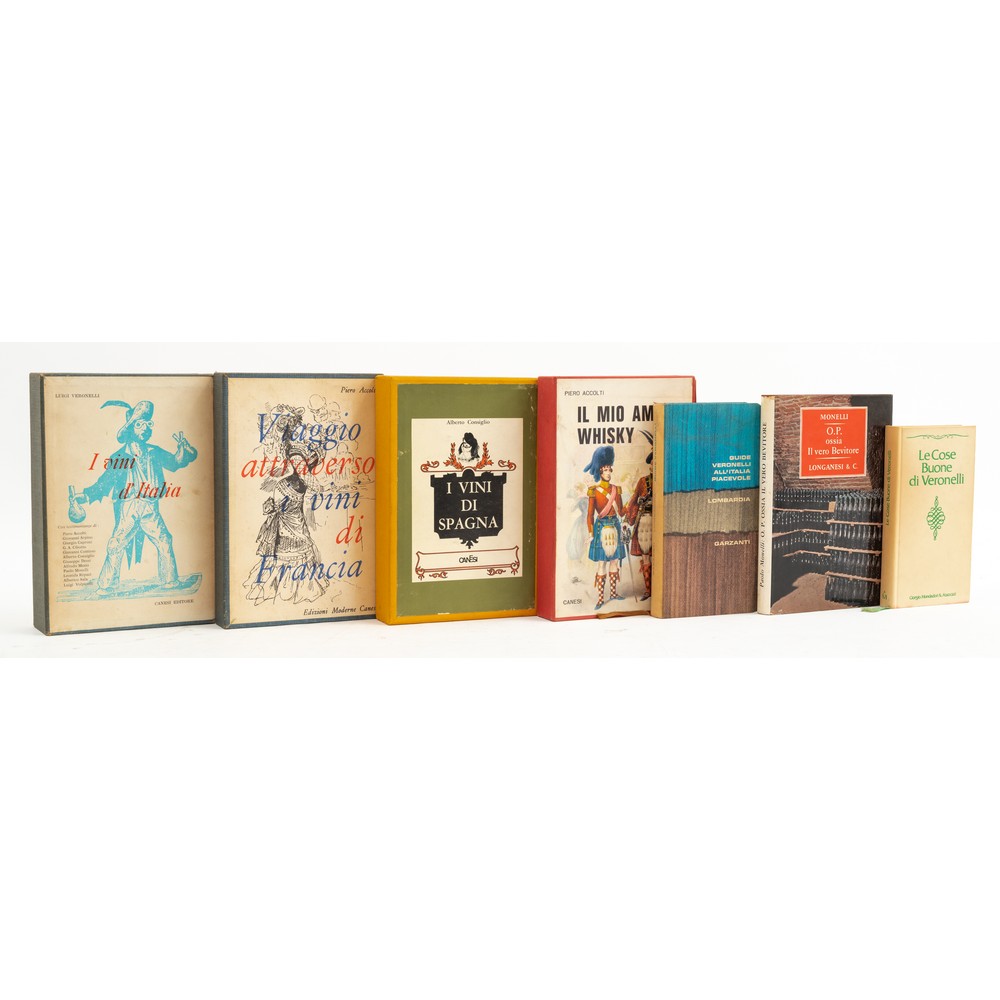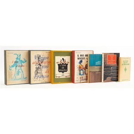 SETTE VOLUMI SU VINI E CANTINE: 1) Luigi Veronelli LOMBARDIA, ed. Garzanti 1968. Legatura editoriale telata rigida illustrata. In ottime condizioni. Pp. 3892) Paolo Monelli IL VERO BEVITORE, ed. Longanesi & C. Milano 1963. Legatura editoriale in tela rigida con sopraccoperta illustrata. In ottime condizioni. Pp. 313. 3) Piero Accolti VIAGGIO ATTRAVERSO I VINI FRANCESI, Edizioni Moderne Canesi 1960. In 8°. Legatura editoriale in piena tela rigida. Titoli in oro al dorso e fregio in oro al piatto. Con acetato protettivo editoriale. Volume custodito entro cofanetto editoriale in tela con figure su carta applicate. In ottime condizioni. Opera graficamente interessante di pp. 196 con molte tavole a colori f.t. e applicate le etichette originali dei vini francesi entro pagine f. t. ripiegate. 4) Luigi Veronelli I VINI D’ITALIA, ed. Canesi 1961. 1^ edizione. In 8°. Legatura editoriale in piena tela rigida. Titoli in oro al dorso e fregio in oro al piatto. Con acetato protettivo editoriale. Volume custodito entro cofanetto editoriale in tela con figure su carta applicate. In ottime condizioni. Opera graficamente interessante di pp. 532 con centinaia di etichette originali dei vini italiani applicate entro pagine f. t. ripiegate. 5) Piero Accolti IL MIO AMICO WHISKY, ed. Canesi 1963. 1^ edizione. In 8°. Presentazione di Paolo Monelli. Legatura editoriale in piena tela rigida. Titoli in oro al dorso e fregio in oro al piatto. Volume custodito entro cofanetto editoriale in tela con figure su carta applicate. In ottime condizioni. Opera graficamente interessante di pp. 285 con molte tavole a colori f.t. e applicate le etichette originali di centinaia di whisky, a livello mondiale, entro pagine f. t. ripiegate.6) Alberto Consiglio I VINI DI SPAGNA, ed. Canesi 1964. 1^ edizione. In 8°. Legatura editoriale in piena tela rigida. Titoli in oro al dorso. Volume custodito entro cofanetto editoriale in tela con figure su carta applicate. In ottime condizioni. Opera graficamente interessante di pp. 253 con molte tavole a colori f.t. e applicate le etichette originali dei vini spagnoli entro pagine f. t. ripiegate.7) Luigi Veronelli LE COSE BUONE DI VERONELLI, ed. Giorgio Mondadori & Associati 1989. In edizione tascabile. Legatura editoriale in Balacron rigido. Pp. 430.