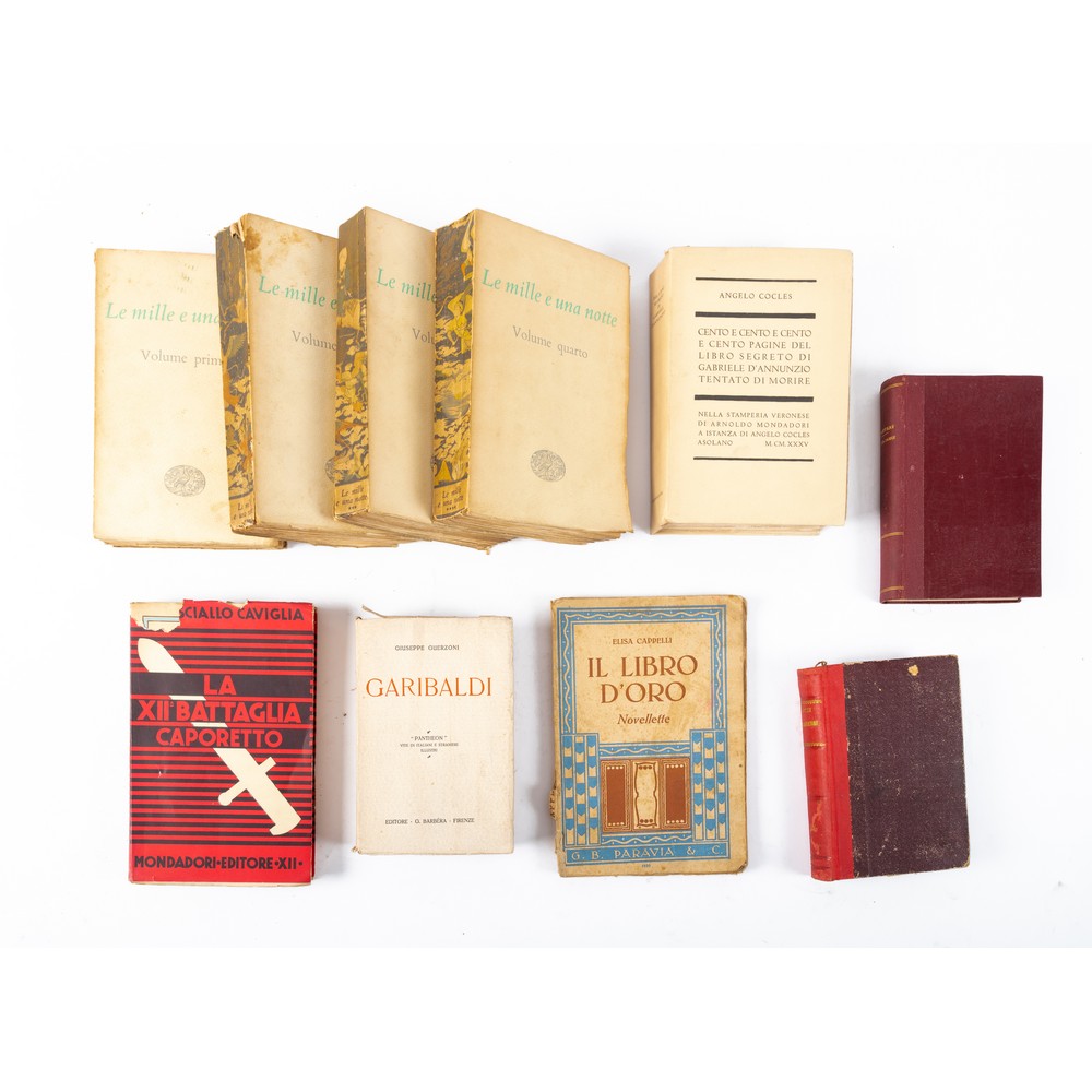 DIECI VOLUMI IN MISCELLANEA: 1) Antonio Stoppani IL BEL PAESE, ed. L. F. Cogliati, Roma 1925. Edizione Stereotipa originale. In 8° piccolo. Rilegatura coeva in mezza tela con piatti cartonati. Pp. 640. 2) Giuseppe Guerzoni GARIBALDI, ed. G. barbera, Firenze 1929. In 8°. Brossura editoriale marginosa in bicromia. Tagli marginosi. Sporadiche fioriture su alcune pagine. In ottime condizioni. Pp. 458. 3) Gasparo Gozzi L’OSSERVATORE, ed. Firenze, G. Barbera 1883. In 8° piccolo. Rilegatura dei primi del ‘900. Pp. 568. 4) Enrico Caviglia LA DODICESIMA BATTAGLIA (CAPORETTO), ed. A. Mondadori 1933 – XII. In 8°. Brossura editoriale in bicromia. Tagli marginosi. Sopraccoperta editoriale in carta figurata. Leggero strappetto alla sopraccoperta. In ottime condizioni. Pp. 309. 5) LE MILLE E UNA NOTTE, ed. Giulio Einaudi 1949. In 4 volumi. Prima versione integrale dall'arabo diretta da Francesco Gabrieli. A cura di Antonio Cesaro, Costantino Pansera, Umberto Rizzitano, Virginia Vacca. Opera completa in 4 Volumi. In 8°. Brossure editoriali e antiporte illustrate. Tagli irregolari e marginosi. Pp. XXVII, 730 (vol.1); XI, 758 (vol.2); IX, 658 (vol.3); IX, 787.6) Angelo Cocles CENTO E CENTO E CENTO E CENTO PAGINE DEL LIBRO SEGRETO DI GABRIELE D’ANNUNZIO TENTATO DI MORIRE, ed. Arnoldo Mondadori 1935. In 8°. Brossura editoriale. Tagli irregolari e marginosi. Brossura slegata. Pp. 446. 7) Elisa Cappelli IL LIBRO D’ORO. NOVELLETTE, ed. G. B. Paravia 1930. In 8°. Brossura editoriale figurata. Tagli marginosi. Antiporta illustrata. Fioriture alle pagine, ma opera in buone condizioni. Pp. 79.