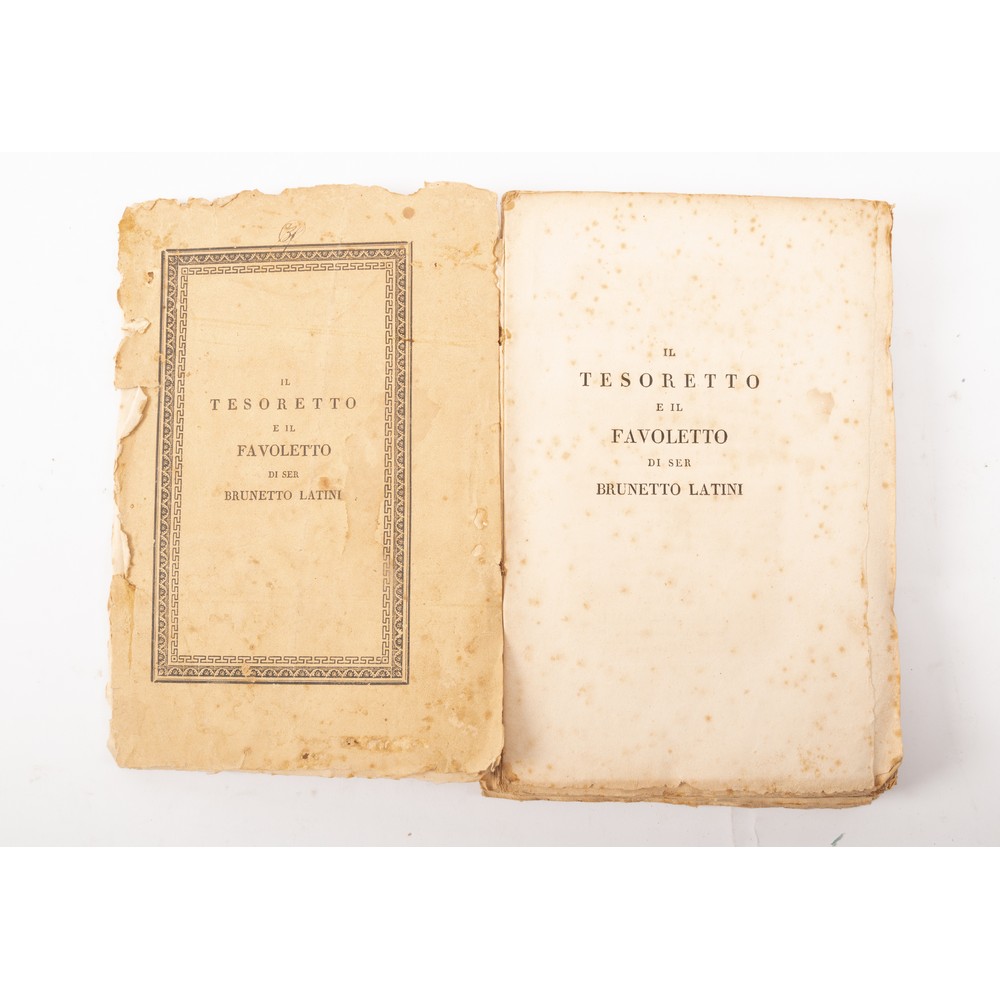 Giovan Battista Zannoni IL TESORETTO E IL FAVOLETTO DI SER BRUNETTO LATINI, ed. Firenze Presso Giuseppe Molini, all’Insegna di Dante 1824. In 8°. Brossura editoriale, anche se slegata. Tagli marginosi. Bruniture del tempo e fioriture alle pagine, ma ininfluenti. Bella edizione ancora in brossura ed in ottime condizioni. Note manoscritte di possesso del 1824. Pp. 259 (1).