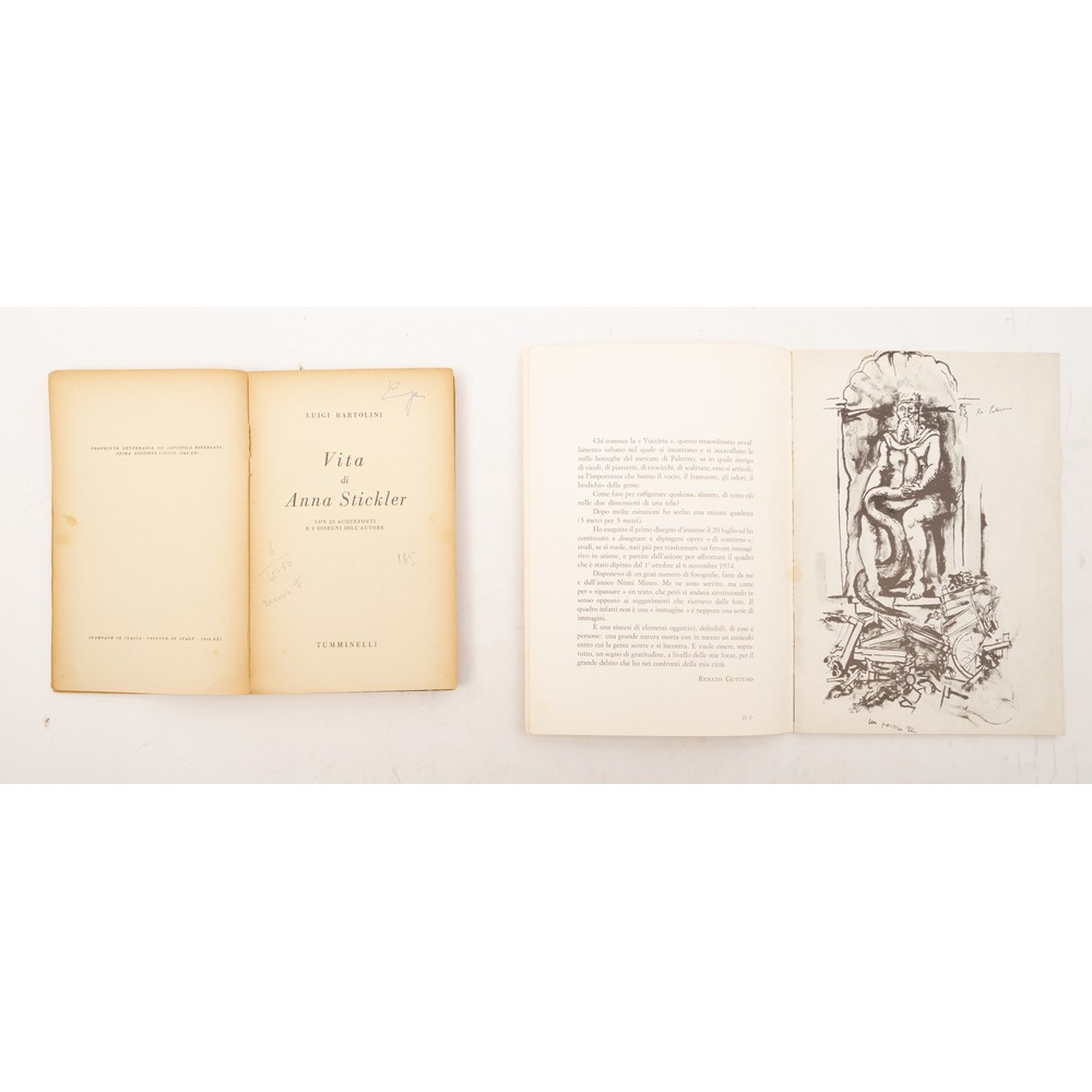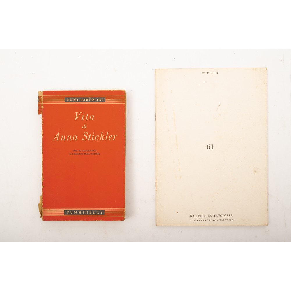 DUE VOLUMETTI D’ARTE: 1) RENATO GUTTUSO, ed. La Tavolozza 1974. Quaderno n. 61 pubblicato in occasione della mostra tenutasi dal 14 Dicembre 1974 al 15 Gennaio 1975. In 8° brossura editoriale. In ottime condizioni. Pp. 32. 2) Luigi Bartolini VITA DI ANNA STICKLER, ed. Tumminelli 1943 – XXI. Con 20 acqueforti e 2 disegni dell’autore. In 8° piccolo. Brossura editoriale. Qualche piccola usura al piatto e al dorso. in ottime condizioni. Pp. 182 (2).