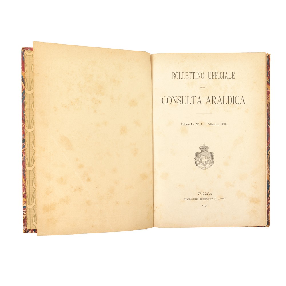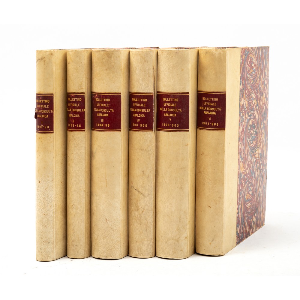 SEI VOLUMI : raccolta del BOLLETTINO UFFICIALE DELLA CONSULTA ARALDICA anni 1891 – 1906. Con 2 tavole f. t. di stemmi più volte ripiegate. Legature in mezza pergamena con piatti marmorizzati. Titoli in oro entro tassello ai dorsi. Bruniture del tempo. Qualche fioritura alle pagine. Annualità complete con circa tremila pagine complessive.