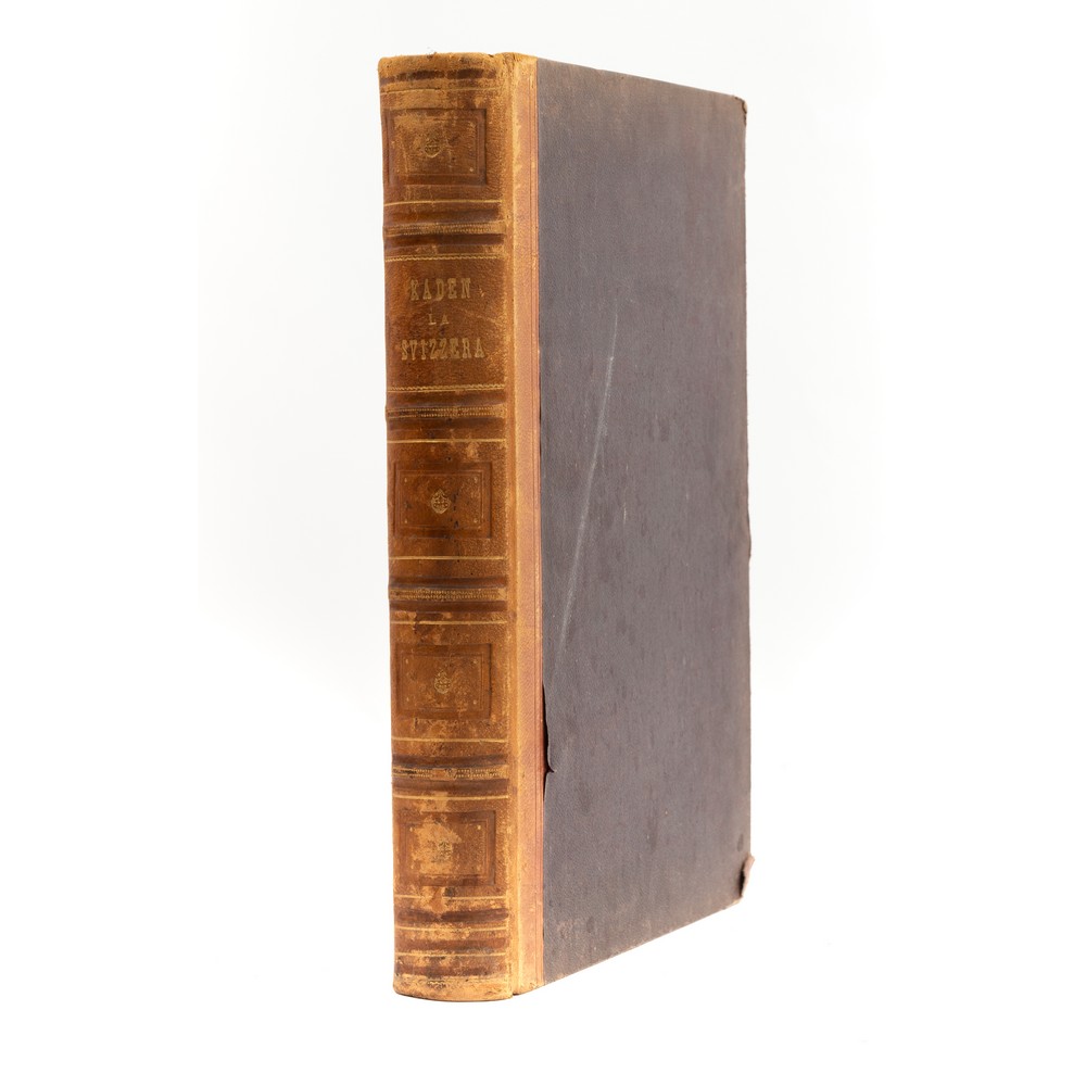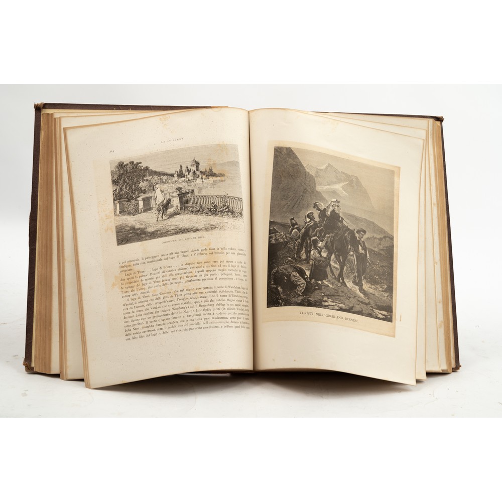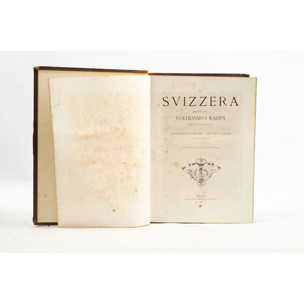 17) Voldemaro Kaden LA SVIZZERA, ed. Fratelli Treves 1878. In folio. Opera composta da 382 incisioni e 64 tavole fuori testo protette con velina degli autori Calame Alexandre e Arthur e altri celebri incisori. Legatura editoriale in mezza pelle con titoli in oro al dorso e nervature. Piatti cartonati telati originali. Fioriture e bruniture sparse. Angoli usurati. Nel complesso in buone condizioni.. Un viaggio romantico nelle valli svizzere con incisioni dettagliate dei luoghi e dei paesaggi. Pp. 506 (6).