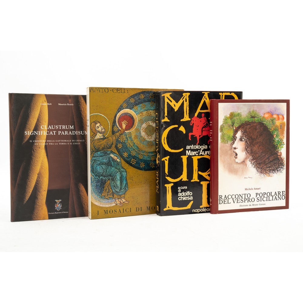 QUATTRO VOLUMI D’ARTE IN MISCELLANEA: 1) Adolfo Chiesa ANTOLOGIA DEL MARC’AURELIO, 1931 – 1954, ed. Roberto Napoleone 1974. 1^ edizione. Legatura editoriale in tela con sopraccoperta editoriale illustrata e cofanetto editoriale illustrato a specchio. Con le straordianrie tavole su cartonato fuori testo. Cm 35 x 26. Pp. 363. 2) Ernst Kitzinger “I Mosaici di Monreale” , ed. Flaccovio 1991. Riedizione del 1960. Cm 30,5 x 28,5. Legatura in tela verde editoriale con titolo in oro impresso al dorso e al piatto, sovraccoperta policroma, 132 pagine, 102 tavole a colori fuori testo, illustrazioni in nero e a colori nel testo, XV pagine con elenco delle tavole e note sui restauri e con l’indice dei principali cicli di Monreale. 5 cartine dei rilievi architettonici, di cui tre ripiegate. Riproduzione integrale della prima edizione pubblicata nel 1960. Traduzione di Fanny Bonajuto.3) Michele Amari RACCONTO POPOLARE DEL VESPRO SICILIANO, ed. Epos 1982. In 4°. Illustrato da Bruno Caruso, con la introduzione di Massimo Ganci. Legatura in pelle con titoli e fregi dorati impressi al dorso. testo e figure stampate su carta acquarello delle cartiere Fedrigoni di Verona. Sopraccoperta editoriale illustrata. Pp. 113 Con 20 disegni nel testo e 12 tavole a colori f. t. Il volume si presenta in perfette condizioni. 4) Guido Meli / Maurizio Rotolo CLAUSTRUM SIGNIFICAT PARADISUM, ed. Provincia Regionale di Palermo 2010. Fotografie di Massimo Lo Verde. Legatura editoriale in seta nera con titoli impressi in oro. Sopraccoperta editoriale illustrata. Cm 34 x 25. Pp. 227.