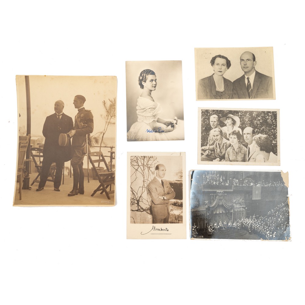 SEI FOTOGRAFIE RELATIVE AI SAVOIA: 1) Fotografia di cm 23 x 18 in bianco e nero che ritrae il Principe di Piemonte Umberto, poi Re Umberto II, in uno scorcio a Villa Igiea, in occasione della sua visita del Febbraio 1929 a Palermo. La fotografia è del fotografo Giuseppe Grassi di Palermo.2) Fotografia dell’Istituto Luce (numero del negativo 5414) con didascalia al retro scritta a mano, cm 18 x 13. Piccole usure agli angoli. 3) Fotocartolina con autografo di Umberto II inviata in Sicilia e firmata dal Ministro della Real Casa Falcone Lucifero, datata 30 Dicembre 1952. 4) Fotocartolina che ritrae Umberto II e consorte inviata in Sicilia e firmata dal Ministro della Real Casa Falcone Lucifero, datata 20 Dicembre 1956.5) Fotocartolina che ritrae la famiglia reale di Umberto II a Cascais e inviata da Roma in Sicilia a firma del Ministro della Real Casa Falcone Lucifero, datata 1960.6) Fotocartolina con autografo di Maria Pia di Savoia inviata in Sicilia e firmata dal Ministro della Real Casa Falcone Lucifero, datata 1960.
