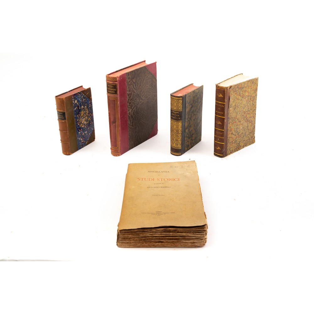 CINQUE VOLUMI in miscellanea: 1) Antonio Salandra POLITICA E LEGISLAZIONE, ed. Bari, Laterza 1915. Bella rilegatura coeva in mezza pelle riccamente lavorata in oro al dorso a decorazione floreale e titolo in oro con piatti marmorizzati, che contiene le brossure originali. in 8°. Poche fioriture sparse, concentrate soprattutto ai tagli. Pp. VI, 500.2) Ottavio Aubry IL SECONDO IMPERO, ed. Garzanti 1940 – XVIII. In 8° grande. Rilegatura coeva in mezza pelle con angoli e piatti marmorizzati. Due nervature al dorso. Titoli in oro entro tassello al dorso. Con 310 illustrazioni e tavole nel testo. Leggere fioriture e qualche sparsa macchiolina. Normale usura d’uso ai piatti. Pp. IX, 624. 3) F. C. Marmocchi RACCOLTA DI VIAGGI DALLA SCOPERTA DEL NUOVO CONTINENTE FINO A DI’ NOSTRI, ed. Prato, Fratelli Giachetti 1840. Solo il tomo 1. In 8°. Legatura coeva in mezza pelle con piatti marmorizzati. Pp. 548.4) Federico Garlanda LA FILOSOFIA DELLE PAROLE, ed. Roma, Società Editrice Laziale 1900. In 8°. Bella rilegatura coeva, che contiene la brossura originale, in mezza pele con angoli e piatti marmorizzati. Quattro nervature al dorso e titoli in oro entro tassello al dorso. Fioriture sparse alle pagine e rare macchioline del tempo. Pp. XVI, 368. 5) AA. VV. MISCELLANEA DI STUDI STORICI IN ONORE DI ANTONIO MANNO, ed. Torino, Officina Poligrafica Editrice Subalpina “Opes” 1912. Solo il volume II. In 4°. Brossura editoriale in bicromia. Tagli marginosi. Leggera brunitura del tempo alle pagine. Pp. 674 (2), con tavole in b.n. f.t.