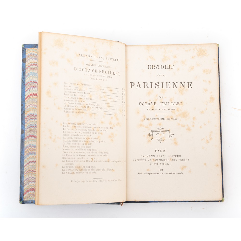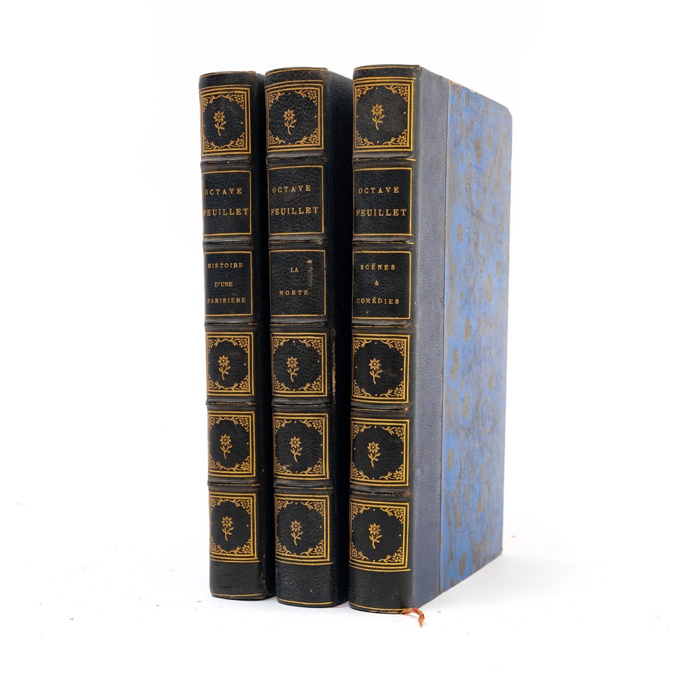 TRE VOLUMI IN LINGUA FRANCESE, CON ELEGANTI LEGATURE, DI OCTAVE FEUILLET, in 16°: 1) SCENES ET COMEDIE, ed. Paris, Calmann Levy 1886. Pp. (2), 389, (1). 2) HISTOIRE D’UN PARISIENNE, ed. Calmann Levy 1881. Pp. 281.3) LA MORTE, ed. Calmann Levy 1886. Pp. (2), 306. Tutti i volumi hanno eleganti legature dei primissimi del ‘900, in mezza pelle di vitello con titoli e fregi incisi in oro al dorso; piatti marmorizzati. Cinque belle nervature al dorso. Contropiatti e risguardie con decorazioni a coda di pavone. Leggere bruniture del tempo a macchie sparse alle pagine, ma volumi in perfetto stato di conservazione.