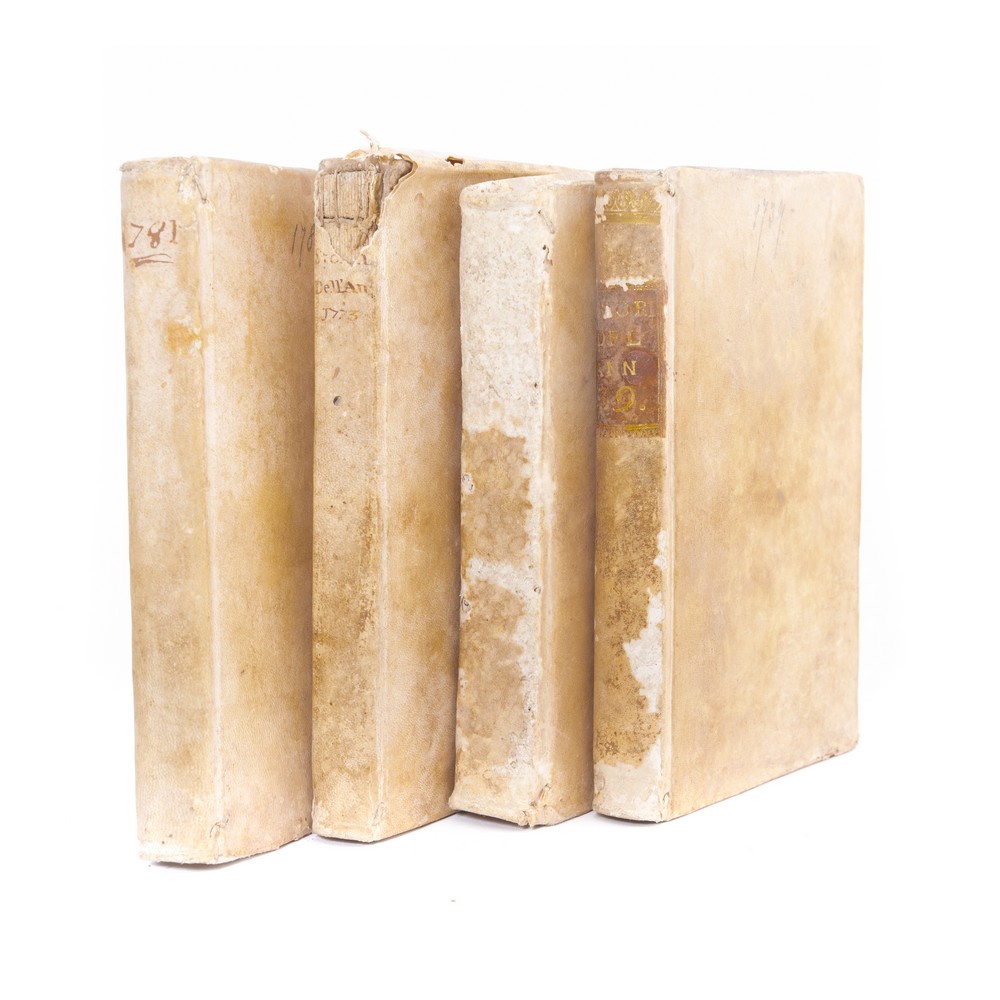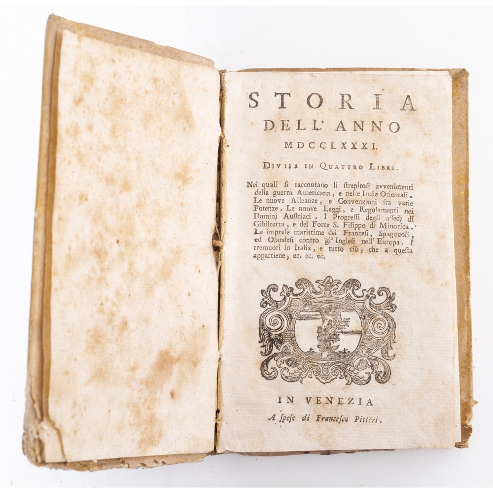 QUATTRO VOLUMI DEL XVII SECOLO: 1) LA STORIA DELL’ANNO 1739, DIVISA IN 4 PARTI. In 16°. Amsterdam A Spese di Francesco Pitteri Librajo in Venezia. Legatura coeva in piena pergamena. Usure e sporcizie. Tagli spruzzati. Vignette xilografiche. Pp. 272. 2) LA STORIA DELL’ANNO 1758, DIVISA IN 4 PARTI. In 16°. Amsterdam A Spese di Francesco Pitteri Librajo in Venezia. Legatura coeva in piena pergamena. Usure e sporcizie. Tagli spruzzati. Vignette xilografiche. Pp. 352. 3) LA STORIA DELL’ANNO 1773, DIVISA IN 4 PARTI. In 16°.In Venezia A Spese di Francesco Pitteri. Legatura coeva in piena pergamena. Usure e sporcizie. Tagli spruzzati. Vignette xilografiche. Pp. 256.4) LA STORIA DELL’ANNO 1781, DIVISA IN 4 PARTI. In 16°. In Venezia A Spese di Francesco Pitteri Librajo in Venezia. Legatura coeva in piena pergamena. Usure e sporcizie. Vignette xilografiche. Pp. 304.