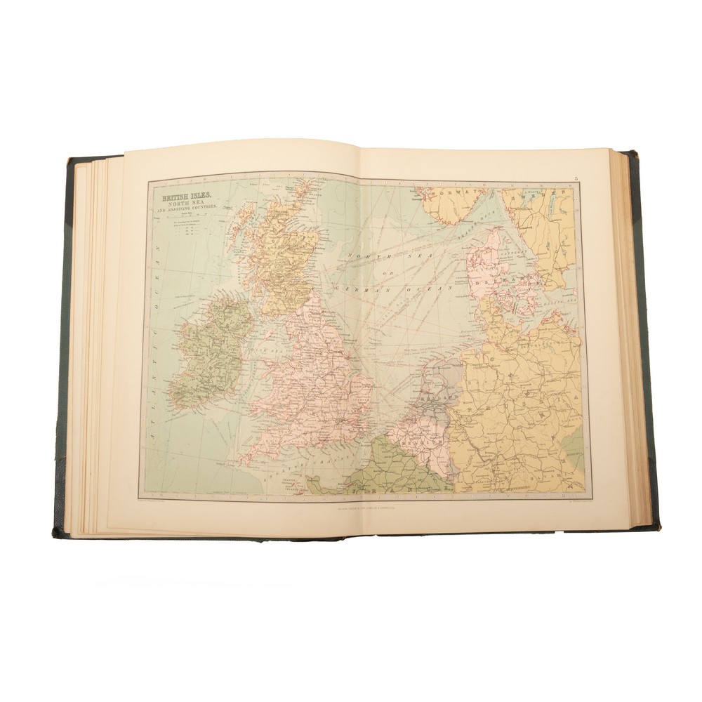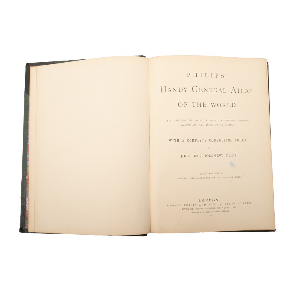 John Bartholomew PHILIPS HANDY GENERAL ATLAS OF THE WORLD, ed. London, George Philip and Son 1876. In folio. Bella legatura editoriale in mezza pelle con angoli e piatti telati, titolo impresso a fuoco in oro. Nervature, titoli e filetti in oro al dorso. Tagli dorati. Con una serie ragionata di mappe storiche e fisiche. Pp. 232 con le mappe e le cartine geografiche a colori a doppia pagina f. t.
