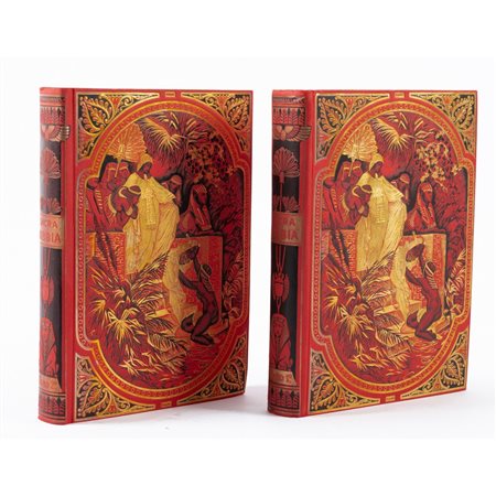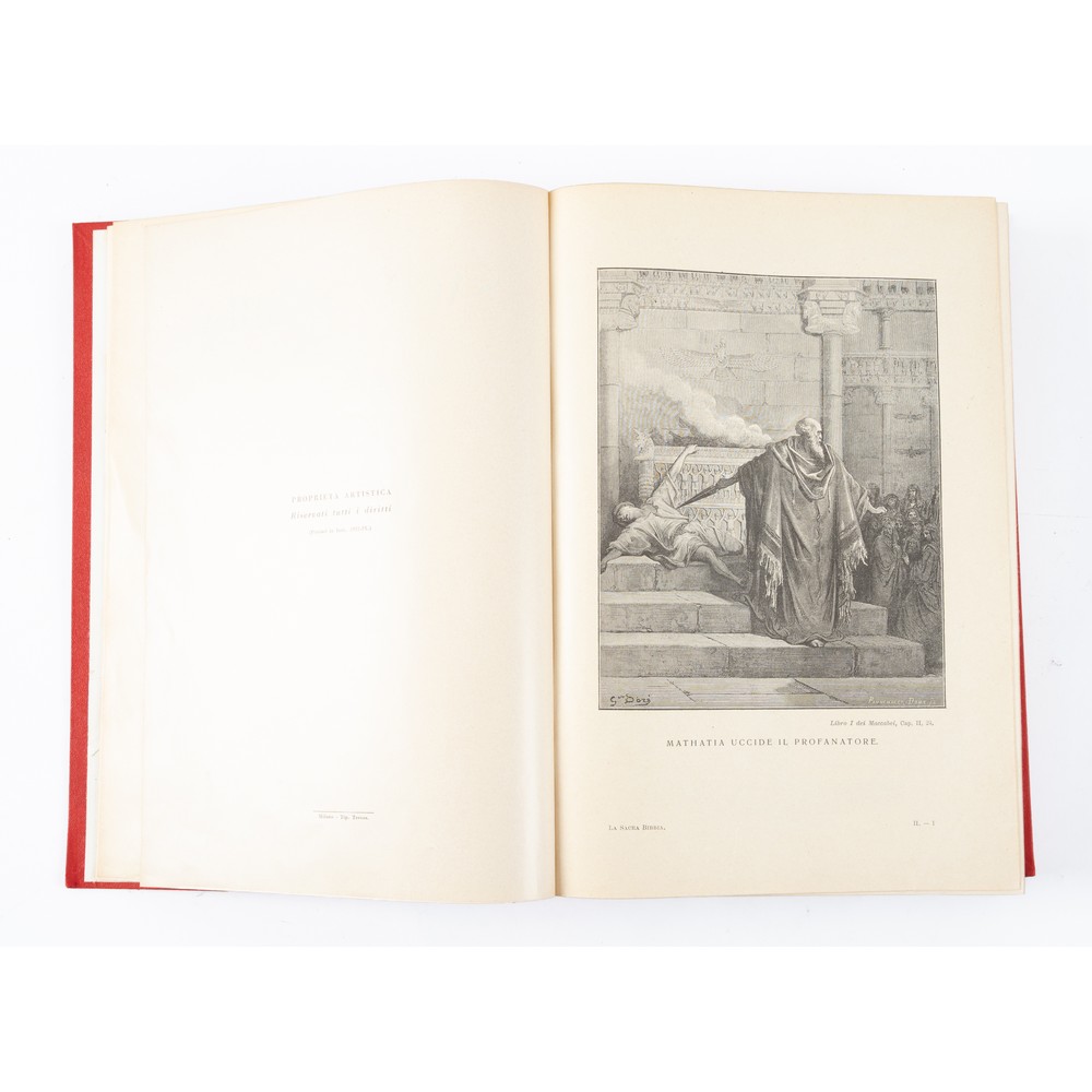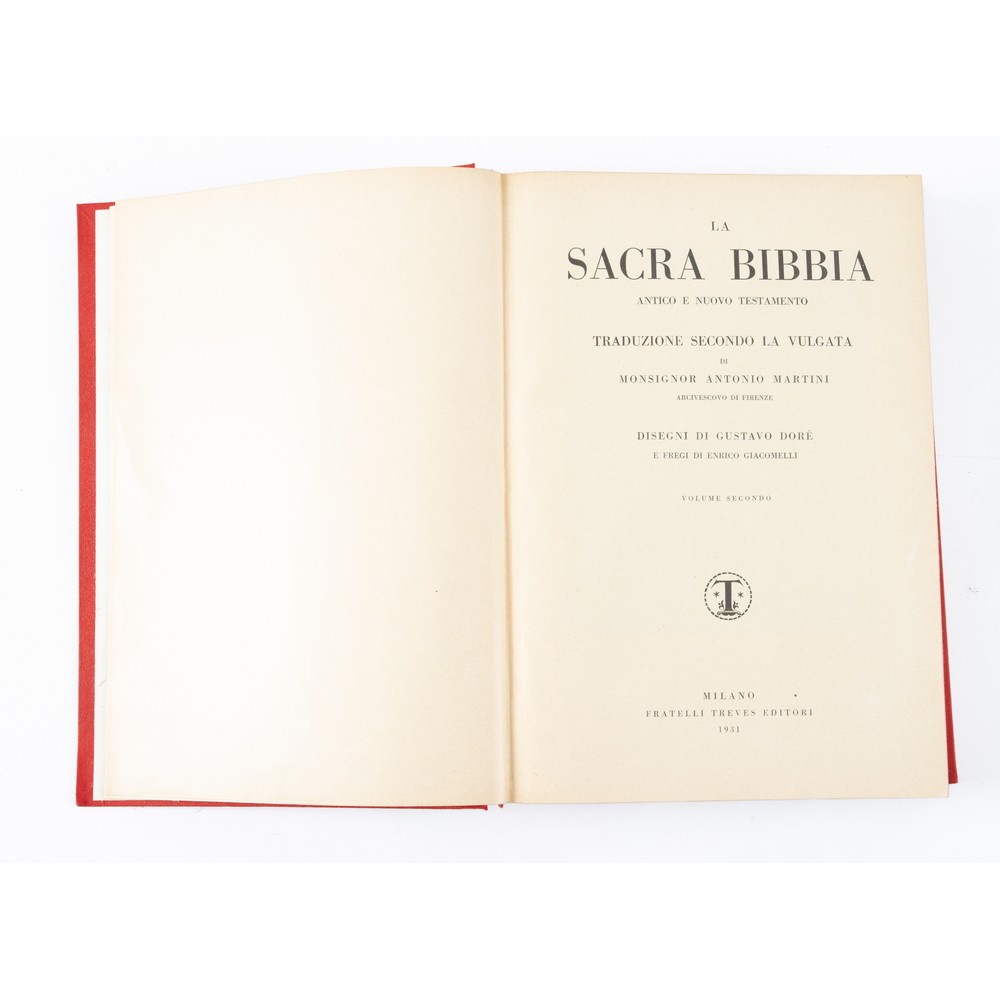 DUE VOLUMI LA SACRA BIBBIA ANTICO E NUOVO TESTAMENTO, ed. Milano, Fratelli Treves 1931. Traduzione secondo la Vulgata di Mons. Antonio Martini con 230 quadri di Gustavo Doré. Pregevole edizione in 2 tomi di cm 28 x 20. Belle legature in percallina riccamente decorata, in policromia rossa, nero e oro con tagli in oro. I volumi sono arricchiti dalle illustrazioni di Gustave Doré. Pp. 944; 839. Volumi in perfette condizioni entro custodie editoriali in cartone muto.