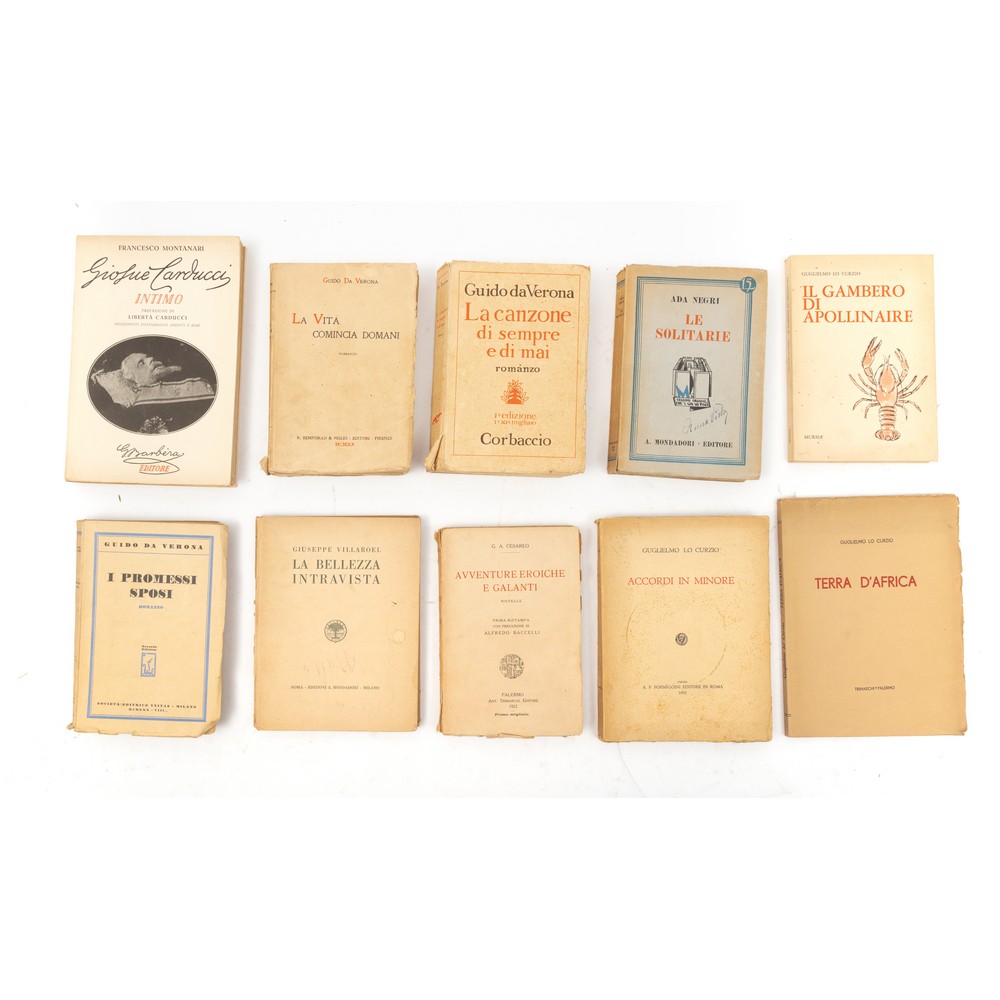 DIECI VOLUMI DI LETTERATURA E POESIE: 1) Ada Negri LE SOLITARIE, ed. A. Mondadori 1931. Cm 20 x 13. Brossura editoriale con mezze ali. Tagli irregolari. In ottime condizioni. Pp. 309. 2) Francesco Montanari GIOSUE’ CARDUCCI INTIMO, ed. G. Barbera, Forezne 1950. Prefazione di Liberta Carducci. In 8°. Brossura editoriale in cartonato illustrato con mezze ali. Tagli irregolari. In perfette condizioni. Pp. 182. 3) Guglielmo Lo Curzio TERRA D’AFRICA, ed. Trimarchi 1936 – XIV. Con dedica autografa dell’autore datata Maggio 1936. In 8°. Brossura editoriale e tagli irregolari. Pp. 71. Alcune bruniture del tempo ma volume in ottime condizioni. 4) Guglielmo Lo Curzio ACCORDI IN MINORE, ed. A. F. Formiggini 1931. Con dedica autografa dell’autore in data Novembre 1936. In 8°. Brossura editoriale marginosa e tagli irregolari. Pp. 170. Alcune sporcizie ai tagli ma pagine pulite e perfettamente conservate. 5) Giuseppe Villaroel LA BELLEZZA INTRAVISTA, ed. Mondadori 1923. In 8°. Legatura editoriale in cartonato rigido. Pp. 143. In buone condizioni. 6) Guglielmo Lo Curzio IL GAMBERO DI APOLLINAIRE, ed. Mursia 1970. Edizione tascabile. Brossura editoriale semirigida con mezze ali. Pp. 89. 7) Guido Da Verona LA VITA COMINCIA DOMANI, ed. R. Bemporad & Figlio, Firenze 1920. In 8°. Brossura editoriale marginosa in bicromia. Tagli marginosi. In ottime condizioni. Pp. 376. 8) Guido Da Verona LA CANZONE DI SEMPRE E DI MAI, ed. Corbaccio 1931. 1^ edizione. In 8°. Brossura editoriale marginosa in bicromia. Tagli marginosi. In buone condizioni. Pp. 415. 9) G. A. Cesareo AVVENTURE EROICHE E GALANTI, ed. Palermo, Trimarchi 1922. In 8°. Brossura editoriale marginosa in bicromia. Tagli marginosi. Carte brunite dal tempo ma volume nel complesso in ottime condizioni. Pp. 376.10) Guido Da Verona I PROMESSI SPOSI, ed. Società Editrice Unitas, Milano 1930 – VIII. In 8°. Brossura editoriale marginosa in bicromia. Tagli marginosi. In ottime condizioni. Pp. 309.
