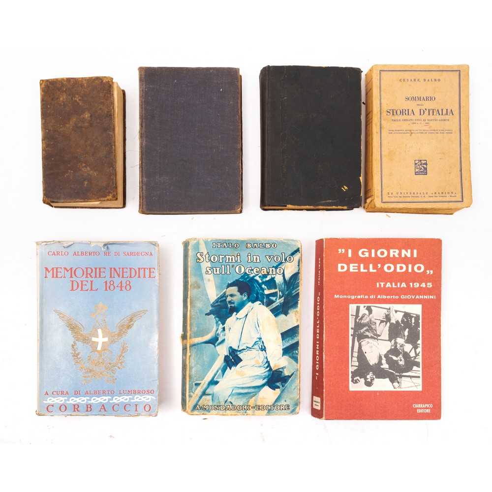 SETTE VOLUMI DI VARIA DEL XIX E XX SECOLO: 1) Gustavo Milani PRIMO PASSO ALLA SCIENZA, ed. Milano, Fratelli Treves 1884. In 16°. Con 567 incisioni. Rilegatura coeva in cartone rigido telato. Pp. XI, 620.2) Italo Balbo STORMI IN VOLO SULL’OCEANO, ed. A. Mondadori Editore 1931. Brossura editoriale illustrata con ali. Tagli marginosi. Cm 23 x 165. Pp. 258 (2). 3) Cesare Balbo SOMMARIO DELLA STORIA D’ITALIA. DALLE ORIGINI FINO AI NOSTRI GIORNI (2600 A. C. – 1848), ed. La Universale Barion 1940. Brossura editoriale. Tagli marginosi. Cm 19,5 x 13. Pp. 495.4) L’ILIADE TRADOTTA DA VINCENZO MONTI, ed. G. C. Sansoni 1892. Con commento di Vittorio Turri. Rilegatura coeva in cartonato rigido muto telato. In 16°. Pp. 283; 24. 5) Carlo Alberto Re di Sardegna MEMORIE INEDITE DEL 1848, ed. Corbaccio 1935. Brossura editoriale figurata a colori con ali. Tagli marginosi. Cm 23 x 16. Pp. 448 con tre tavole f. t. più volte ripiegate sugli schieramenti di battaglia. 6) Alberto Giovannini I GIORNI DELL’ODIO, ed. Ciarrapico 1975. Brossura editoriale. Cm 24 x 16. Pp. 275. Con molte fotografie f.t. in bianco e nero. 7) UFFIZIO DELLA SETTIMANA SANTA CON LA VERSIONE ITALIANA DI MONS. MARTINI, ed. Napoli Dalla Tipografia di Paci 1839. In 16°. Legatura editoriale in piena pelle con titoli impressi in oro al dorso. Coperta leggermente slegata al dorso. Normali segni d’uso. Gore e fioriture sparse. Pp. 540.