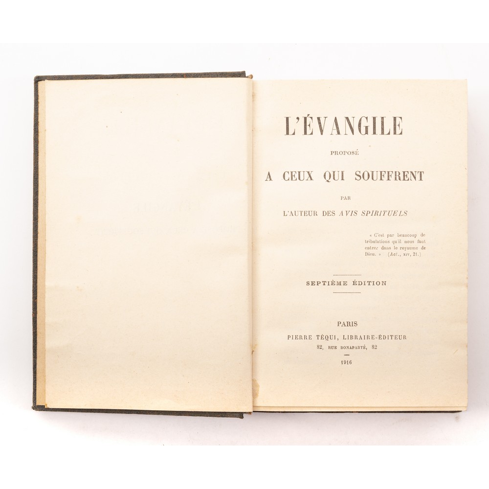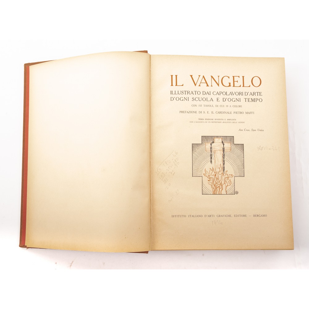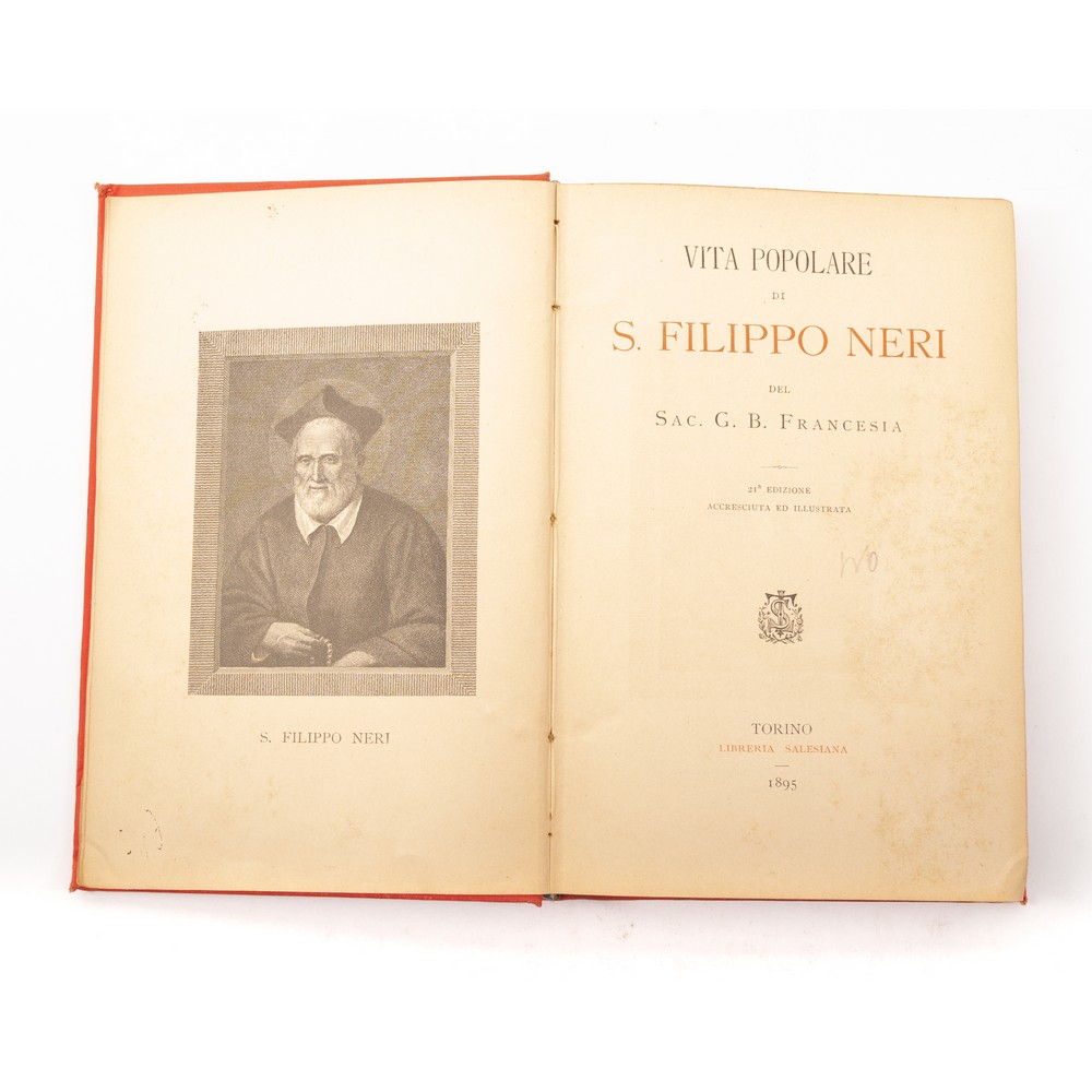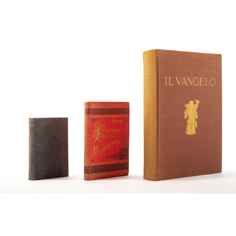 TRE VOLUMI DI RELIGIONE: 1) Cardinale Pietro Maffei – introduzione di - IL VANGELO ILLUSTRATO DAI CAPOLAVORI D’ARTE D’OGNI SCUOLA E D’OGNI TEMPO, ed. Istituto Italiano d’Arti Grafiche 1934. In 4°. Legatura editoriale in piena tela con applicazione a rilievo raffigurante il “ Buon Pastore”. Con 157 tavole di cui 19 a colori applicate a tutta pagina. In ottime condizioni. Leggera usura d’uso. Pp. 346. 2) L’EVANGILE PROPOSE’ A CEUX QUI SOFFRENT, ed. Paris Pierre Tequi 1916. In 16°. Bella edizione in lingua francese di questo Vangelo che venne pubblicato durante la 1^ guerra mondiale per portare conforto nella immane catastrofe della guerra. Nota manoscritta di possesso in antiporta. Pp. VII, 676. 3) Francesia Giovanni Battista VITA POPOLARE DI S. FILIPPO NERI, ed. Torino, Libreria Salesiana 1895. In 8°. Bellissima legatura editoriale in percallina rossa rigida con titoli e fregi impressi in oro al piatto e al dorso e riccamente arabescata a secco in nero ed in oro ai piatti e al dorso. Edizione accresciuta e corretta di questa celebre vita di San Filippo Neri. L'autore dell'agiografia nel 1853 fece la vestizione clericale e nel 1855-56 cominciò la sua attività d'insegnante di latino e di altre materie umanistiche. Quell'anno ebbe come allievo Domenico Savio, canonizzato nel 1954. Nel 1859 fece parte del piccolo drappello che con don Bosco diede vita alla nuova Congregazione dei salesiani. Visse a stretto contatto con San Giovanni Bosco. All'interno del volume numerose testatine, finalini e iniziali ornate di cui alcune anche a colori, varie incisioni a piena pagina n. t. che ricostruiscono alcuni fatti salienti della vita del Santo. In ottime condizioni di conservazione.al foglio di guardia nota manoscritta di possesso della Duchessa di Sorrentino. Pp. 321.